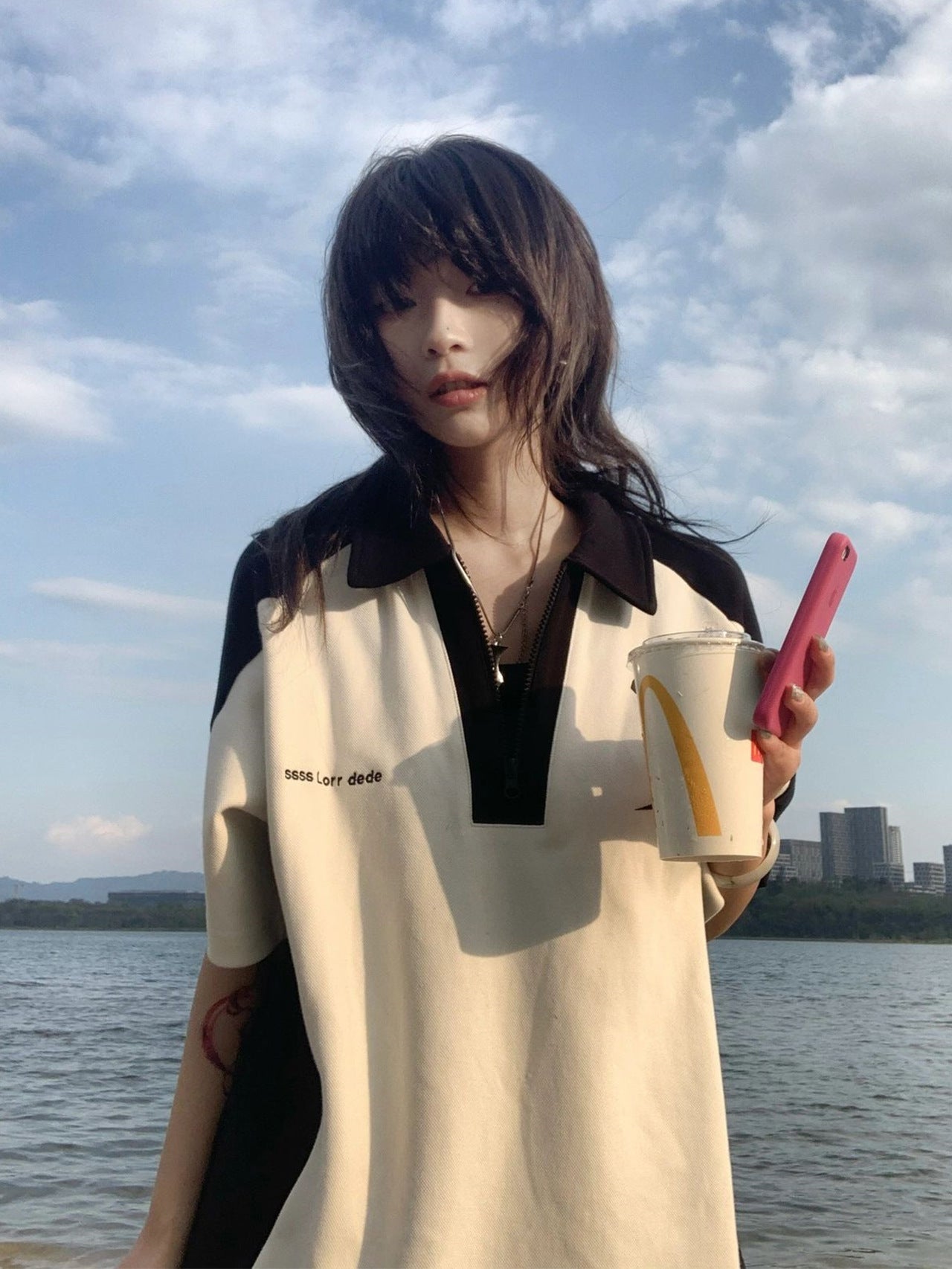 90s streetwear American Preppy Style Short-Sleeved T-shirt Women's Summer Contrast Color Stitching Polo Collar T-shirt round Neck Heavy Couple Top Ins