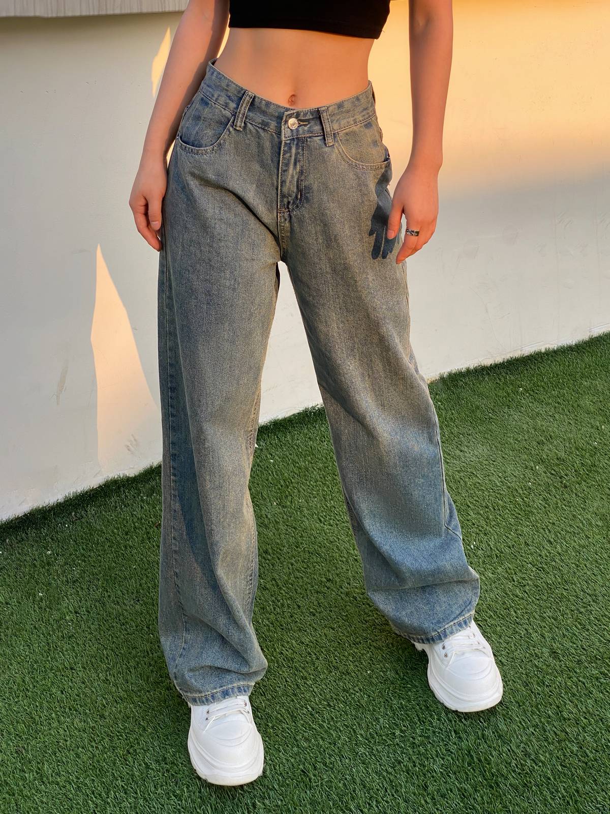 Design: These nostalgic washed jeans cut on high rise waistline. shaped to a relaxed fit. with multi pockets and zip button fastening.