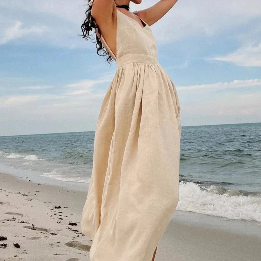 Enjoy effortless beach style in this A-line sling cotton V-neck dress. Featuring spaghetti straps and a backless design. this mid-calf fit-and-flare dress is made from a natural cotton and linen blend for a comfortable yet chic look. Perfect for warm sunny days!