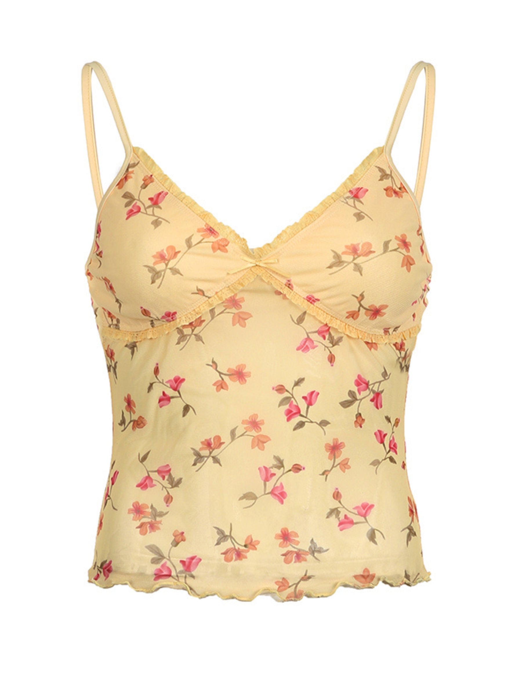 Add some playful style to your wardrobe with our Cara Floral Print Mesh Tank Top in Yellow! Featuring a hot pink and red mini floral print on soft and breathable mesh fabric. this sleeveless top is perfect for a sexy yet romantic look. With its slim fit and V-neck design. it's a must-have from our IFOMT Spring-Summer Collection.