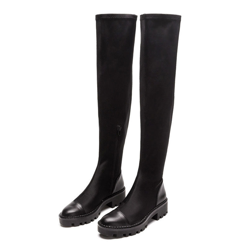 The block heel boots are all about making a statement that everyone will remember! Made of PU leather and rubber. embellished with a panelled design upper presented with seamed stitch detailing. featuring a round toe along with a padded footbed. a welt stitching. a lugged rubber outsole framed by a mid block heel. a half zipper fastening at the side. an over-the-knee shaft length trimmed with an elastic opening. Find more trendy women's leather boots and unique shoes in our boutique. and wear them with a party mini and a sparkly choker to complete the stunning look - Heel height: 4.5cm.