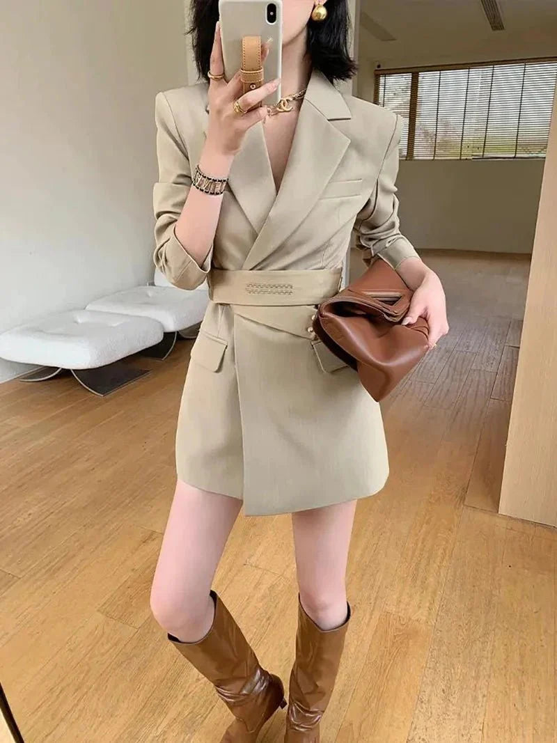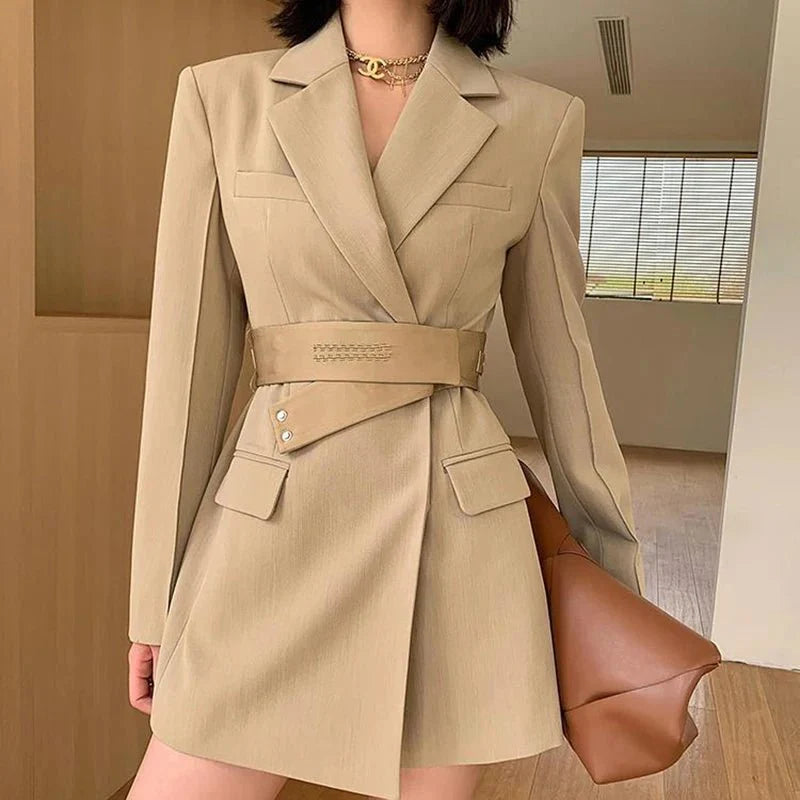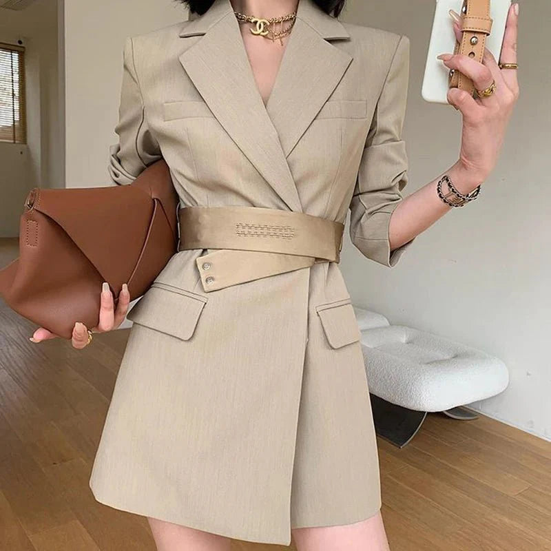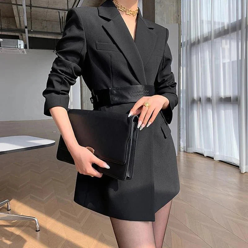 Design: This chic slim-fit suit dress features a stylish blazer with a notched neckline and a flattering A-line silhouette. The dress is paired with a belt. accentuating the empire waistline for a sophisticated office look. The single-breasted closure completes the polished appearance. perfect for professional settings.