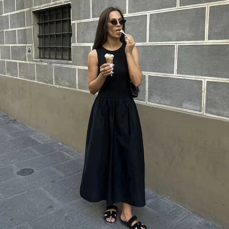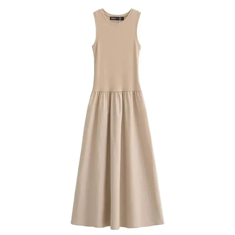 This elegant and chic long dress is designed for a sophisticated yet casual look. Featuring a slim fit and A-line silhouette. it flatters the figure while maintaining a relaxed. elegant style. The O-neck adds a classic touch. and the sleeveless design makes it perfect for warmer seasons. Made from high-quality polyester. this dress is both comfortable and stylish. The mid-calf length provides a graceful. flowing appearance. while the solid pattern ensures versatility for various occasions. Ideal for summer events. parties. or casual outings.