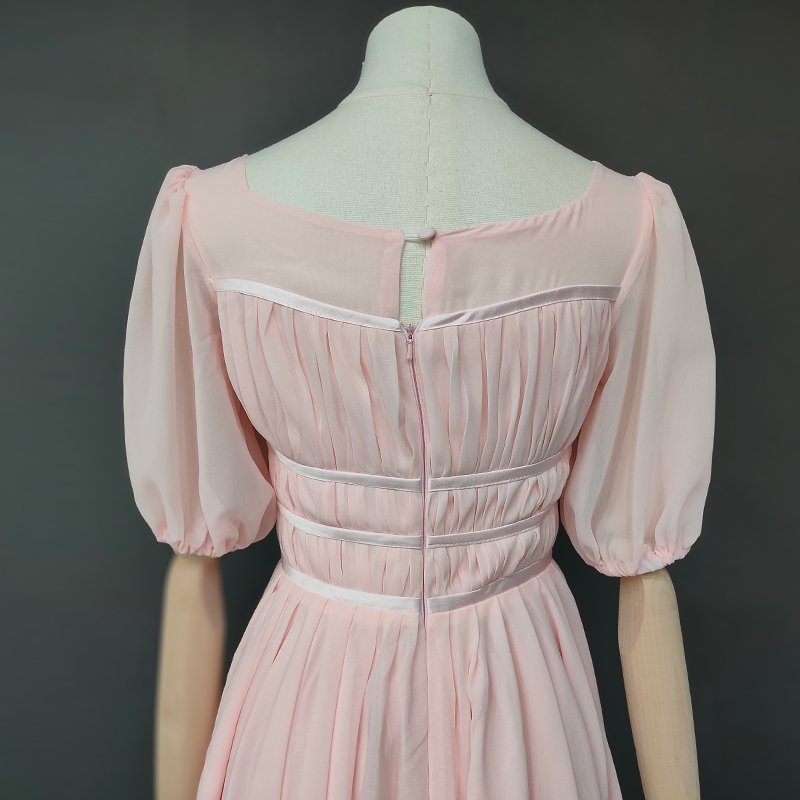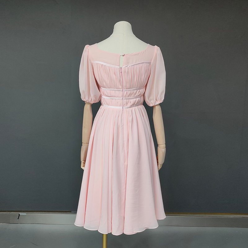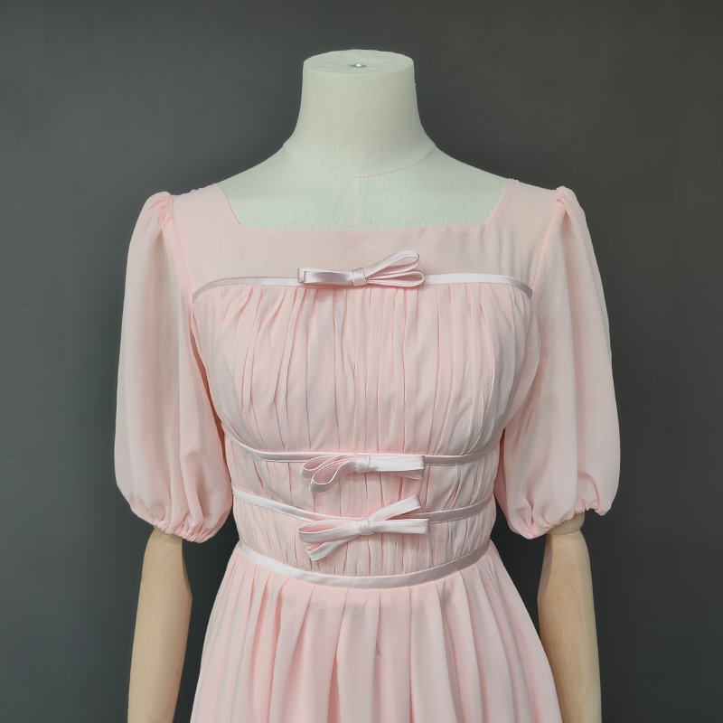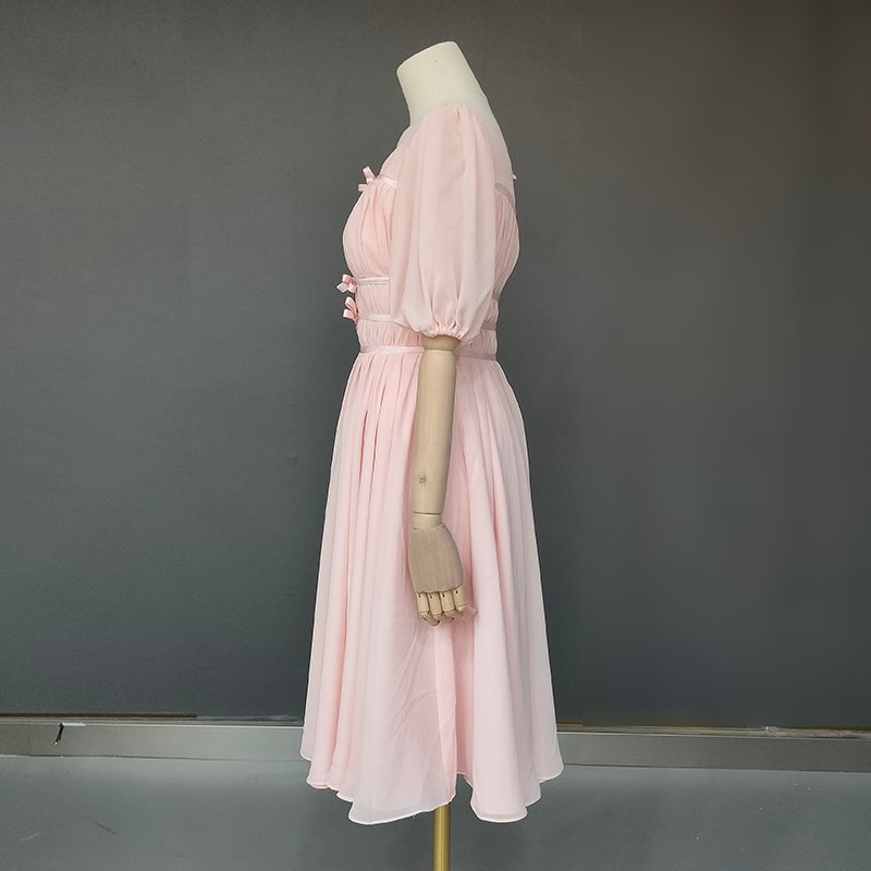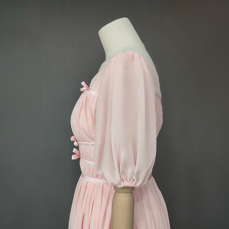 This elegant tea-length gown is perfect for a whimsical wedding or musical cosplay. Designed with a flattering square neckline and half lantern sleeves. it features ruched details. pleats. and a charming bow decoration. Made from lightweight chiffon. the A-line silhouette and natural waistline provide a graceful. comfortable fit. The back zipper closure and built-in bra add practicality to its enchanting style. Customizable to suit your preferences. this dress offers a timeless princess-inspired look for your special day.
