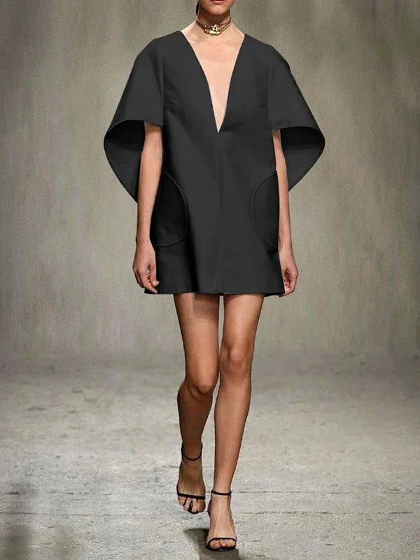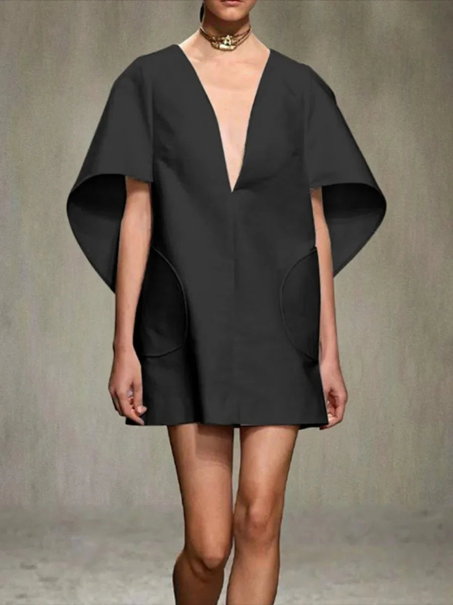 Design: A breezy mini dress featuring a deep V-neckline. half-flare sleeves. and a relaxed straight silhouette for effortless style and comfort.