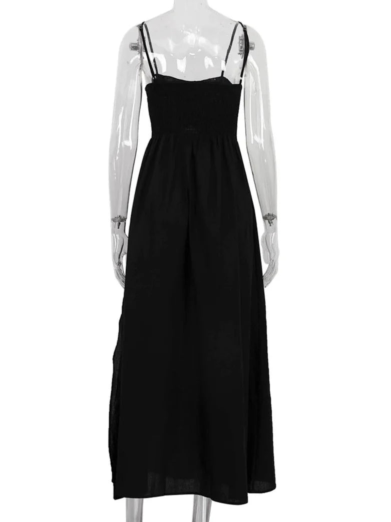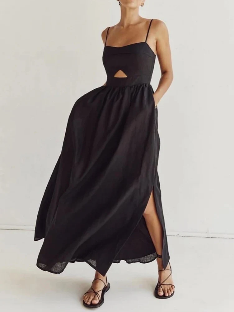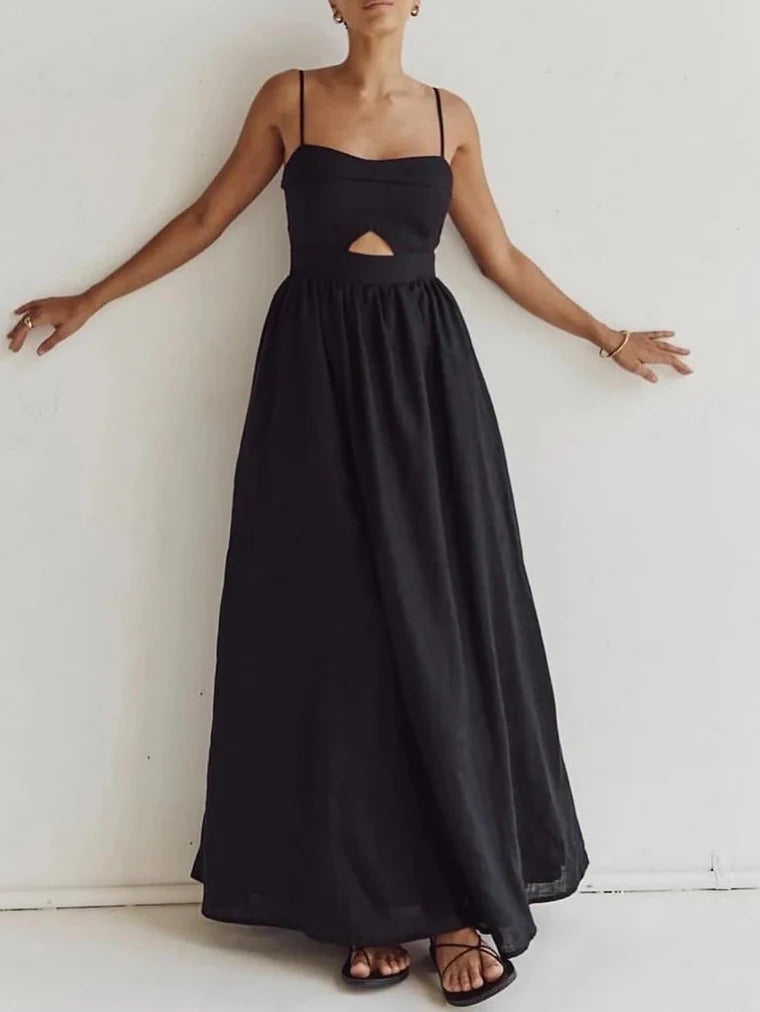 Design: A sleeveless camisole-style dress with a slash neckline and loose A-line silhouette. designed for a relaxed yet elegant fit. The hollow-out design adds a sophisticated touch. making it perfect for casual or semi-formal occasions.