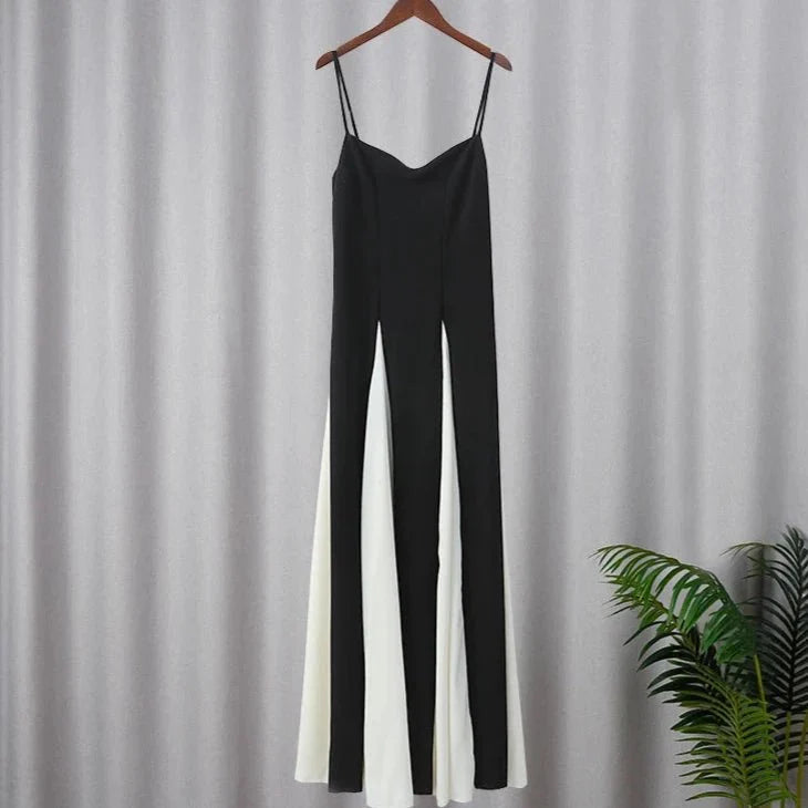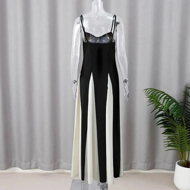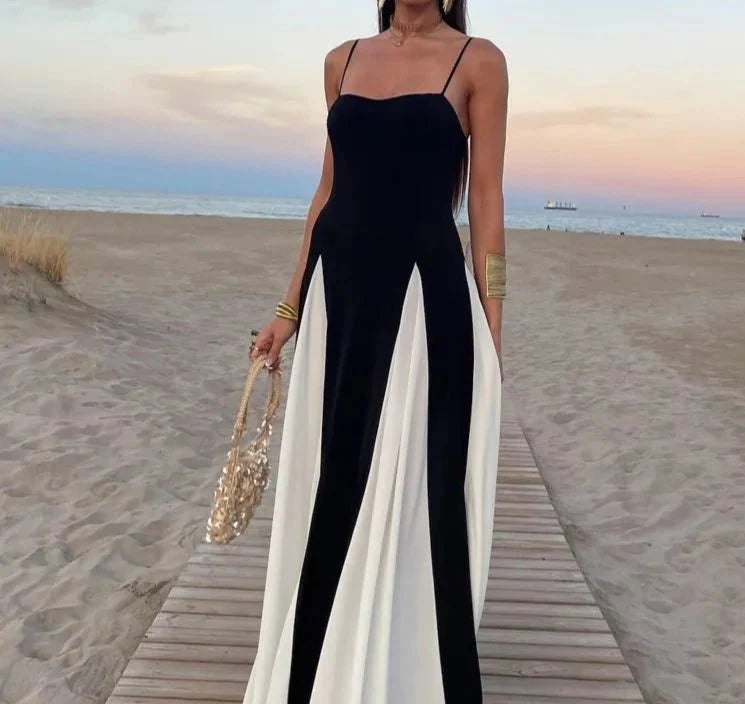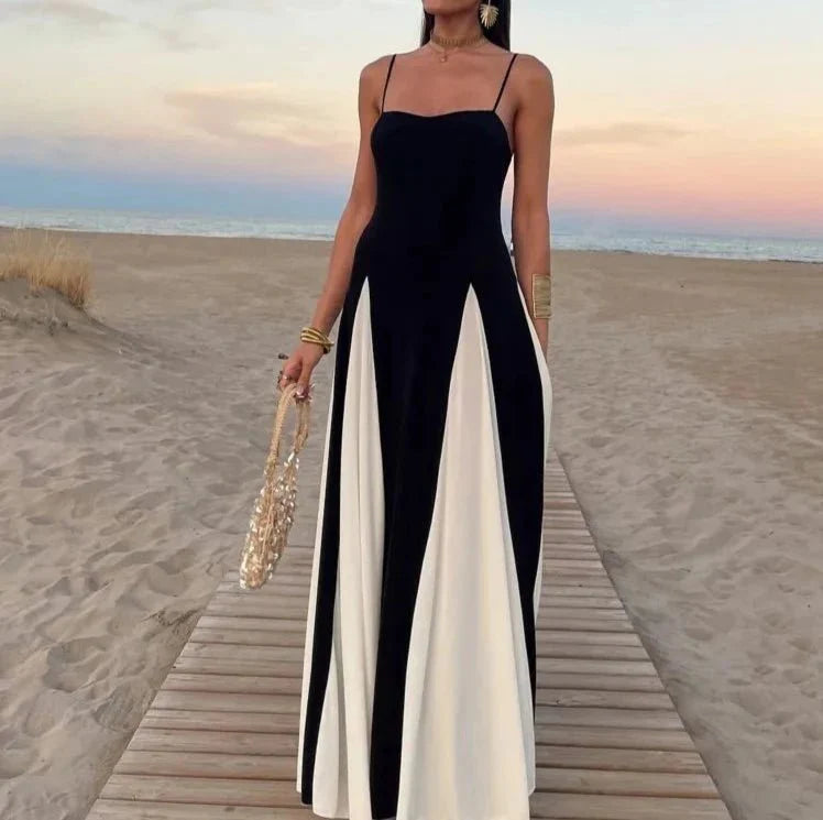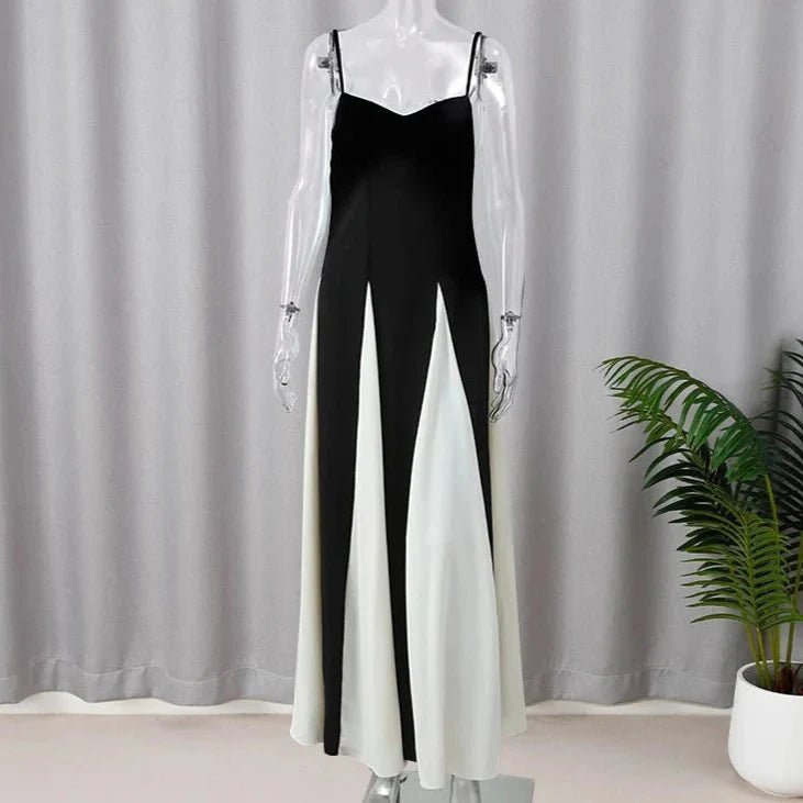 Turn heads with the Elegant Black and White Fashion Dress. a chic addition to your spring and summer wardrobe. This high-street style dress features a striking patchwork pattern in classic black and white. giving it a modern and sophisticated look. Crafted from non-stretch polyester. it offers a slim fit and a flattering straight silhouette that falls gracefully to the floor. The V-neckline adds a touch of elegance. while the empire waistline enhances your figure. With a sleeveless design and easy pullover closure. this floor-length dress is perfect for making a bold fashion statement at any event.