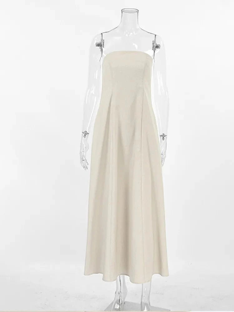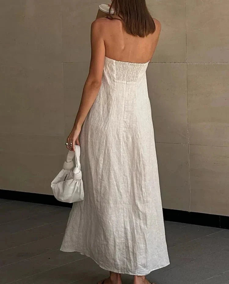Achieve effortless elegance with this strapless long dress. featuring three-quarter lantern sleeves. a V-neckline. and an ankle-length A-line silhouette. Made from polyester and linen. this casual dress offers slight stretch and an empire waistline for a comfortable yet chic look.