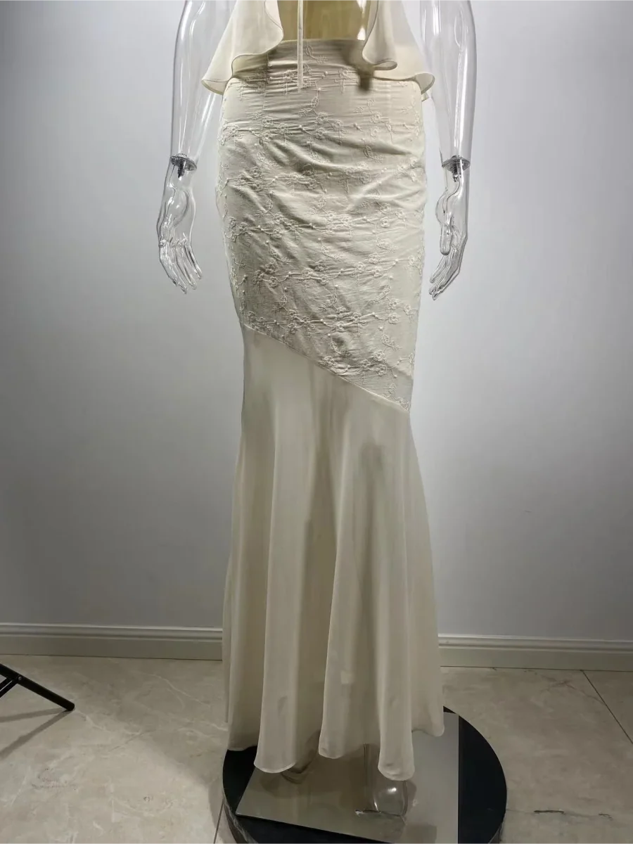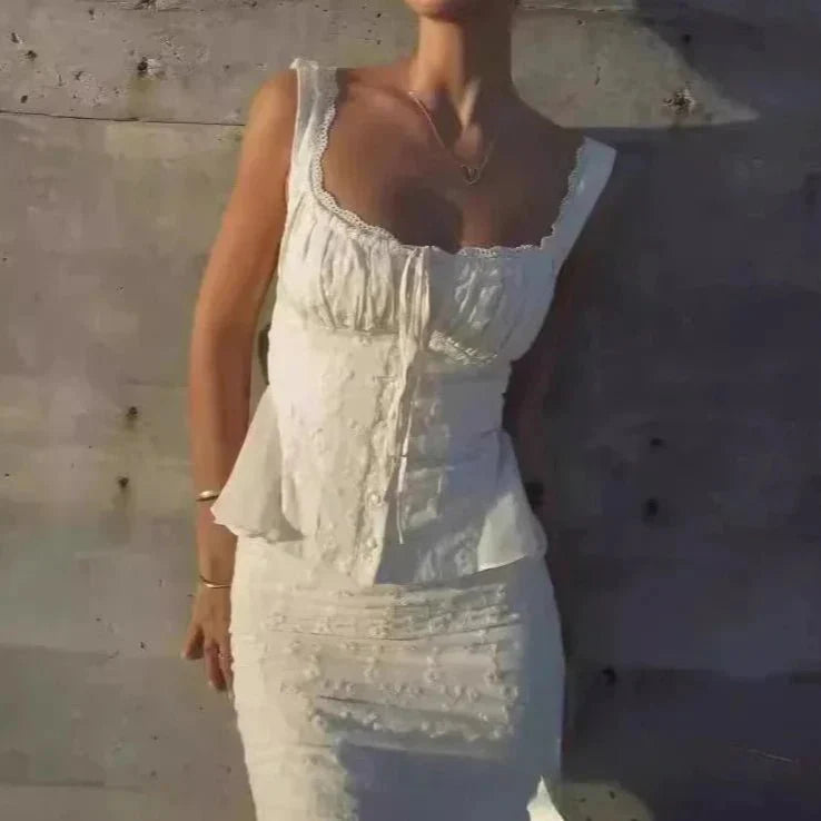 This elegant mermaid dress two-piece set features a sleeveless design with a straight silhouette and ankle-length skirt. Made from a blend of polyester and cotton with lace decoration. it offers a high street style with a solid pattern. The set includes a slim-fit top with a single button closure and a skirt with a zipper fly. ideal for a chic summer look.