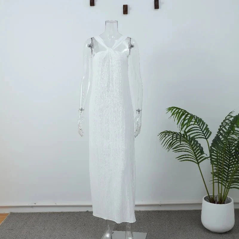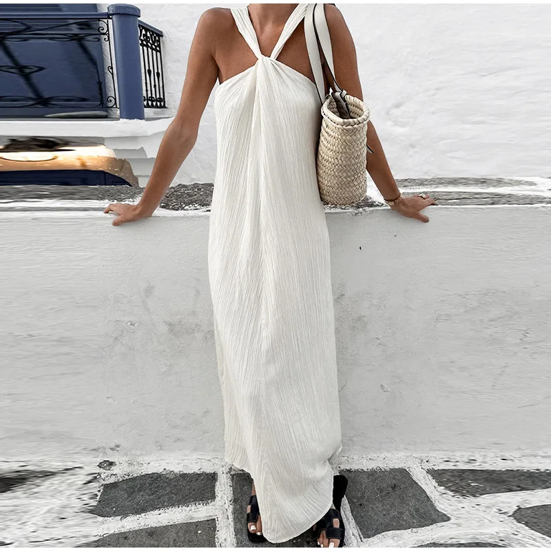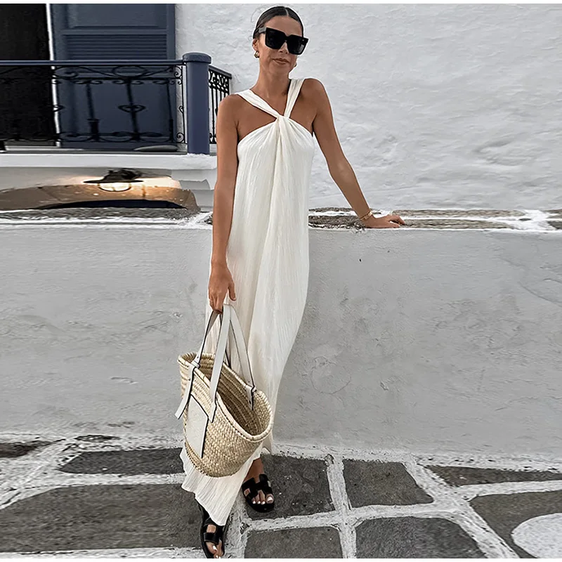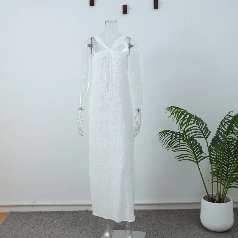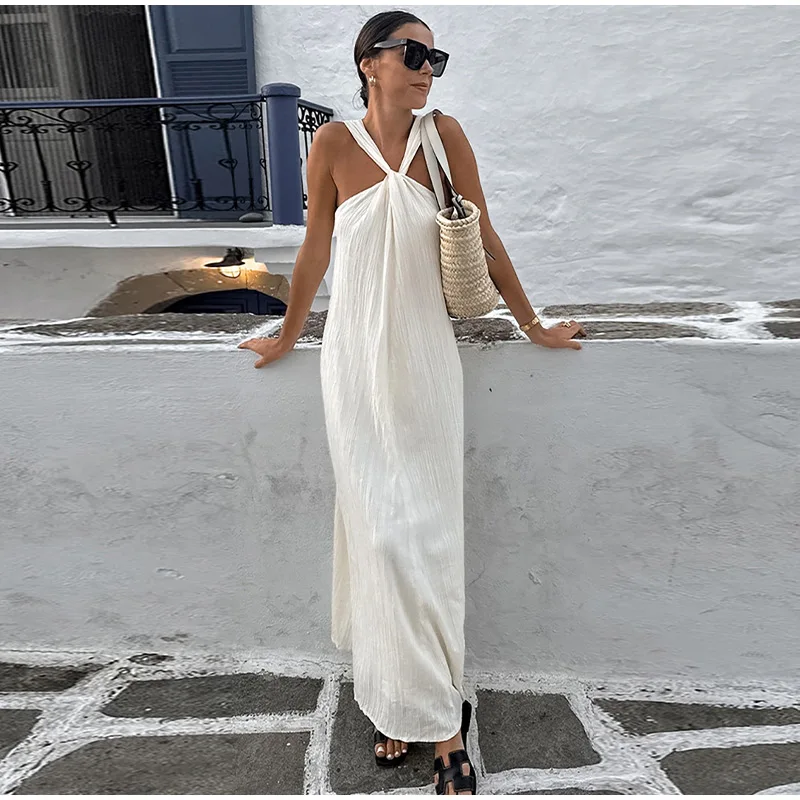 This elegant pleated halter dress features a loose. straight silhouette and backless design for a chic streetwear look. Made from lightweight polyester with slight stretch. it offers a strapless. sleeveless style and a floor-length fit. Perfect for casual or evening wear. the dress has a pullover closure and natural waistline.