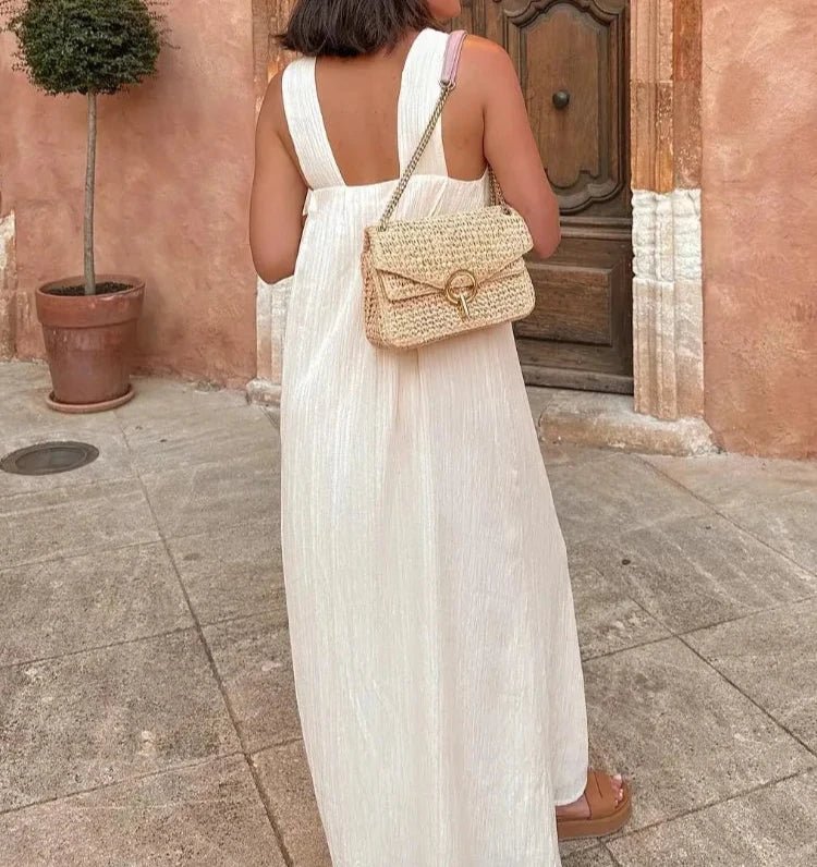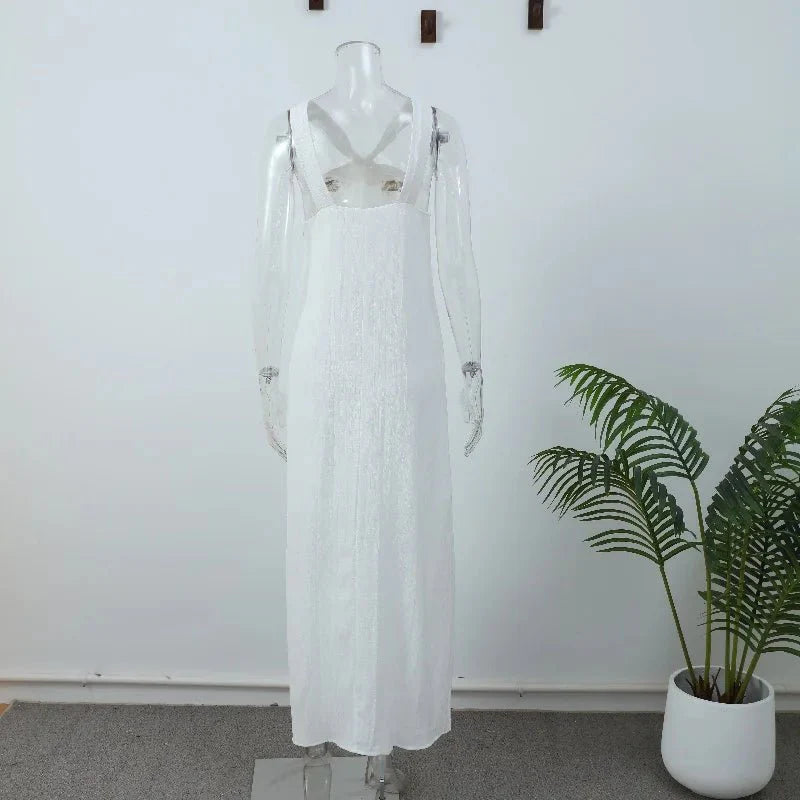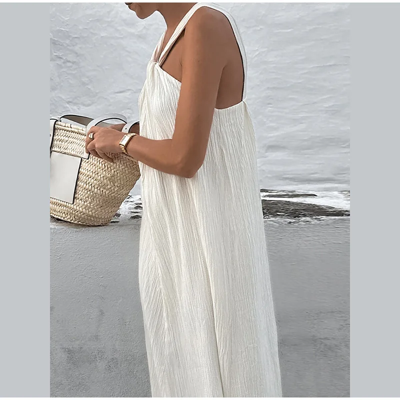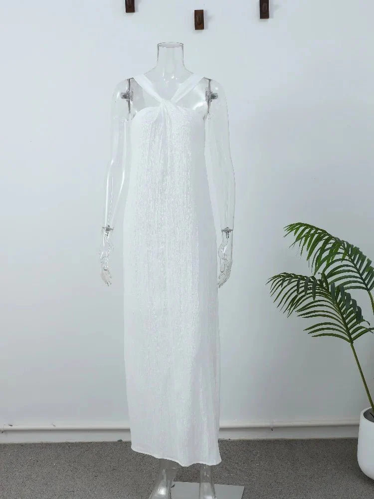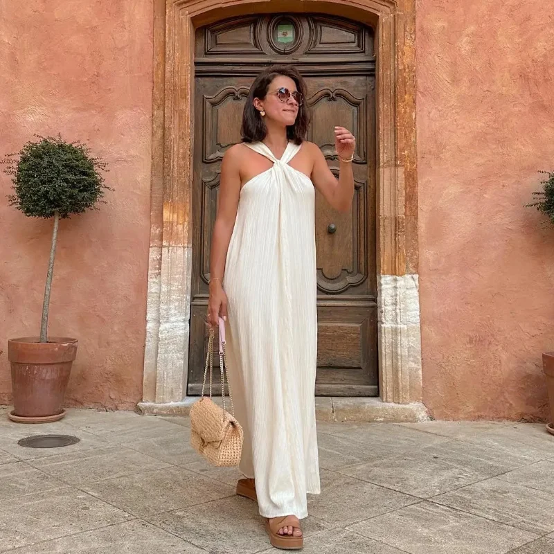 This elegant pleated halter dress features a loose. straight silhouette and backless design for a chic streetwear look. Made from lightweight polyester with slight stretch. it offers a strapless. sleeveless style and a floor-length fit. Perfect for casual or evening wear. the dress has a pullover closure and natural waistline.