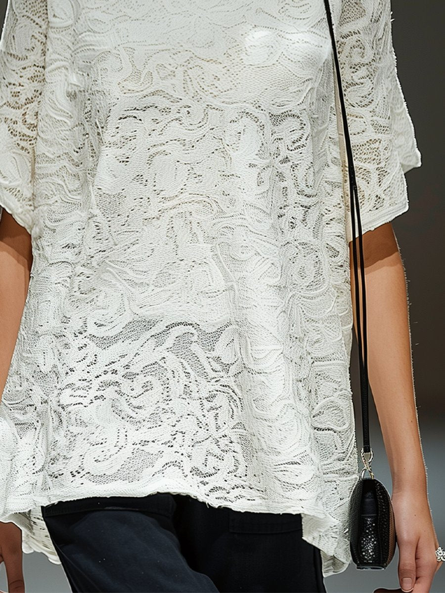 This comfortable white lace t-shirt with a round neckline and mid-length sleeves exudes simplicity and elegance. The lace fabric adds a delicate texture and a touch of sophistication to the classic t-shirt style. making it suitable for various occasions.