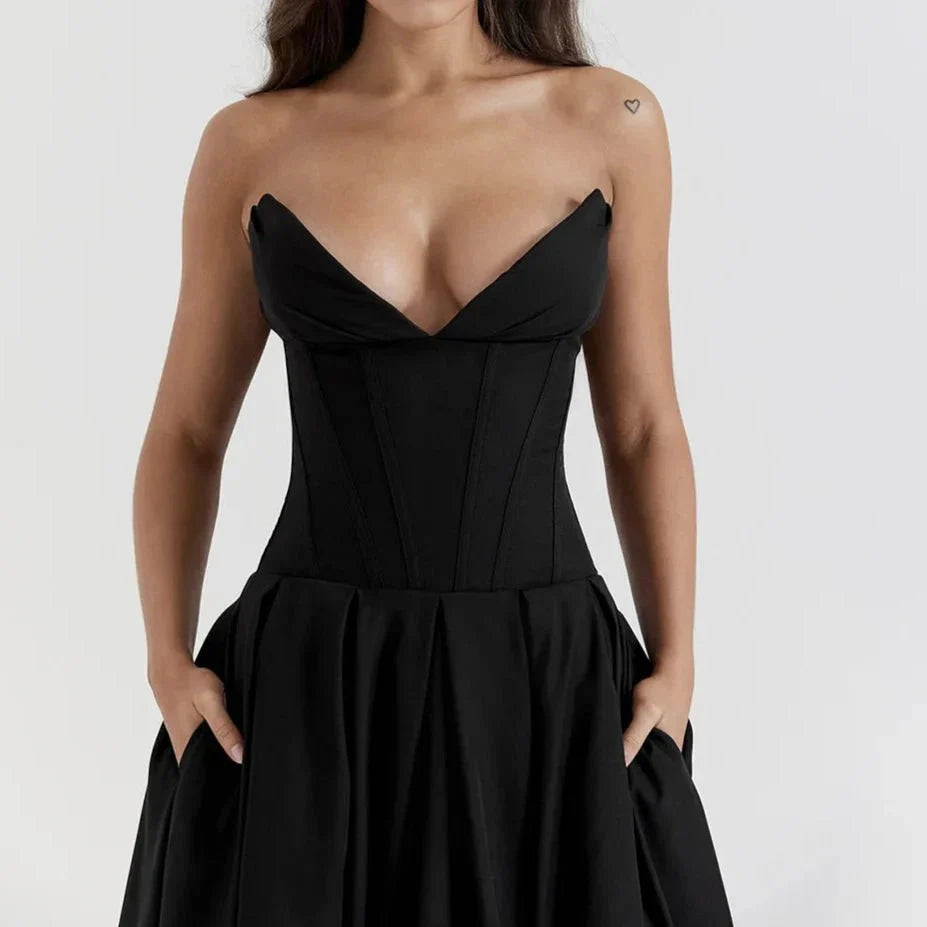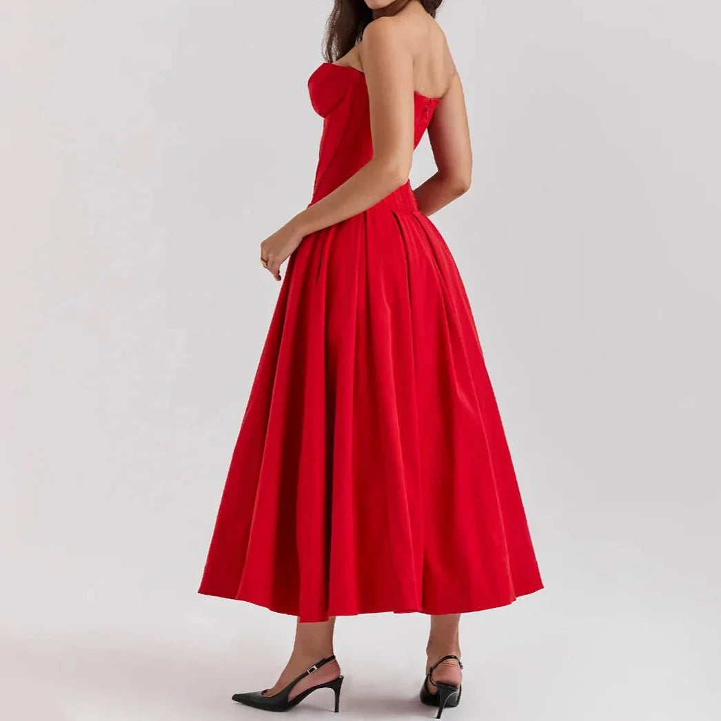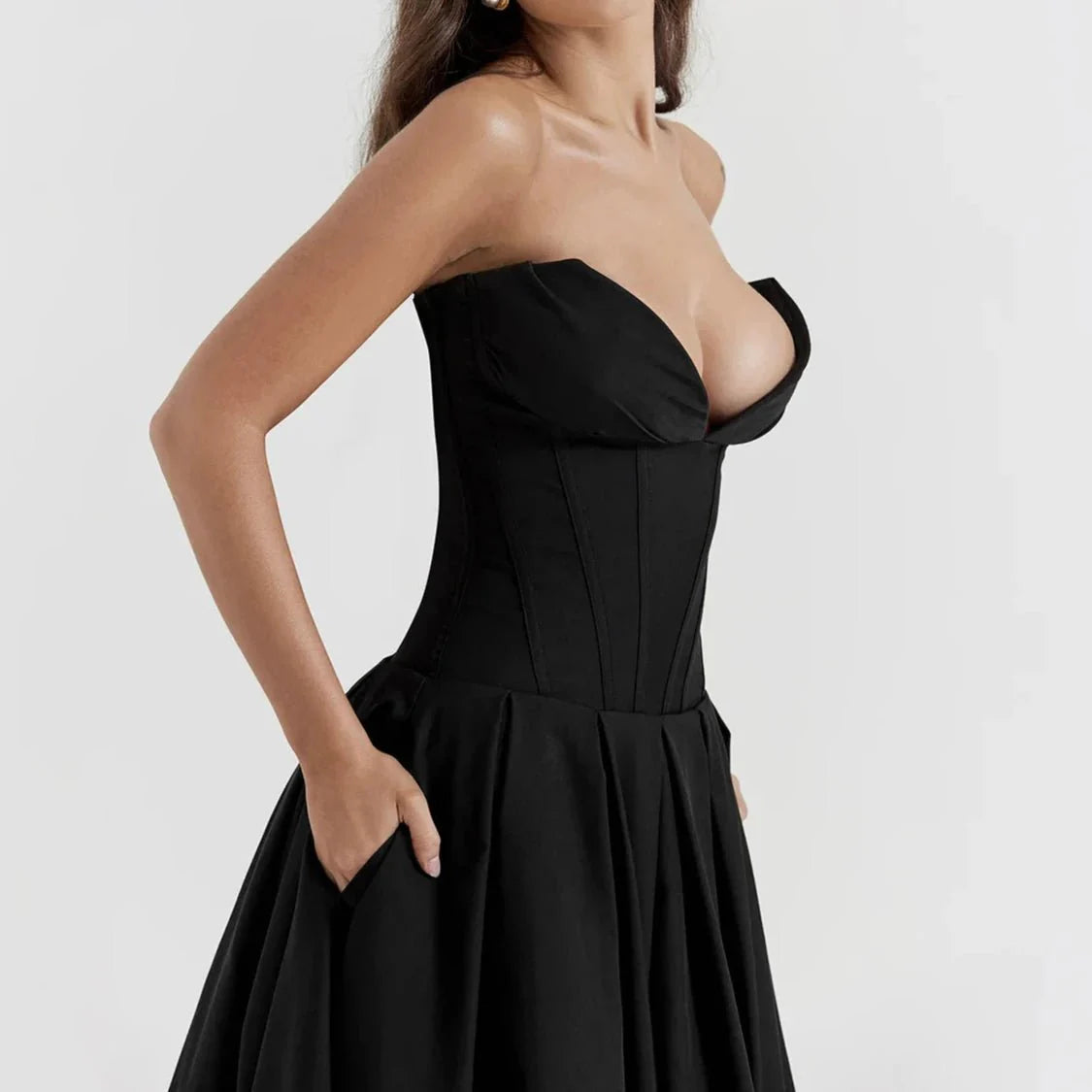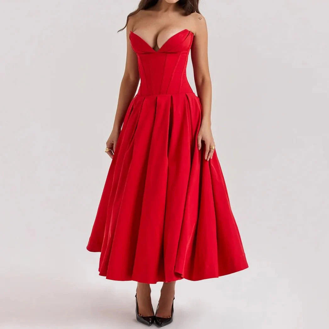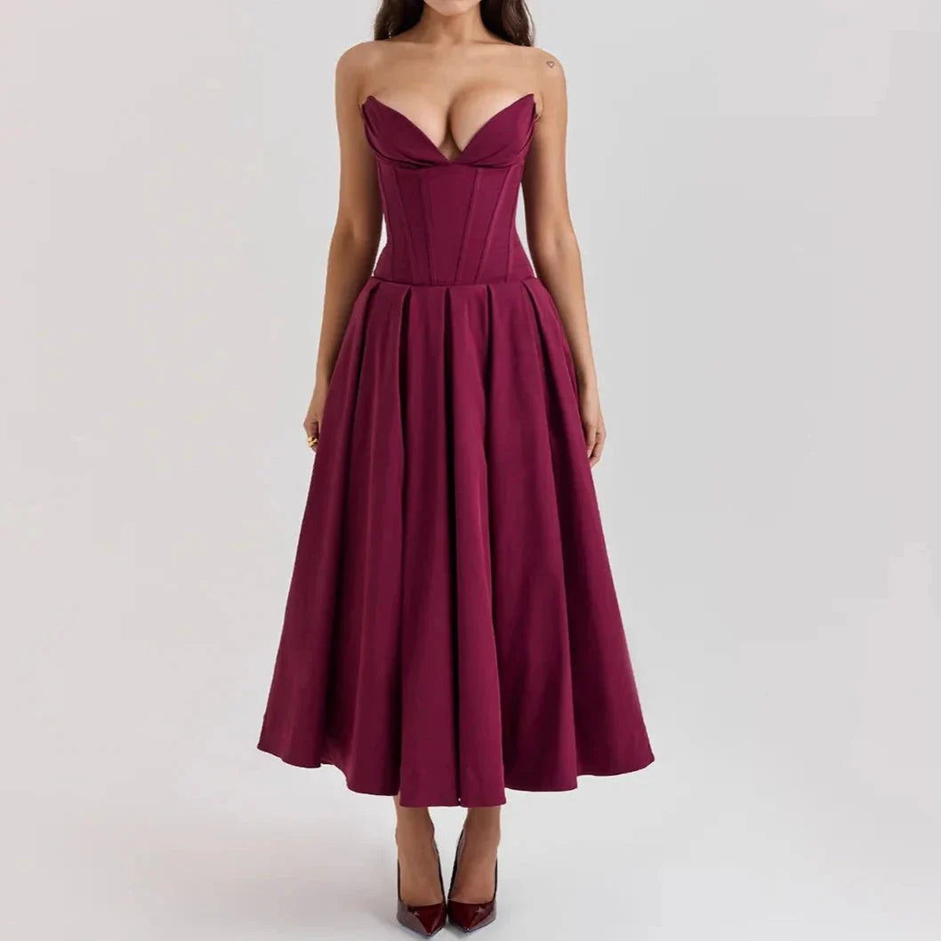 Make a statement with the Elegant Summer Strapless Dress. a perfect blend of sophistication and style for any formal occasion. Crafted from high-quality polyester with slight stretch. this dress offers a comfortable slim fit that enhances your figure. The strapless neckline and fit-and-flare silhouette create a timeless and flattering look. while the mid-calf length adds a touch of elegance. Designed in a solid color. this dress features a sleek zipper detail for easy wear. Suitable for all seasons. this sleeveless dress is a versatile addition to any wardrobe. perfect for making an impression at any formal event.