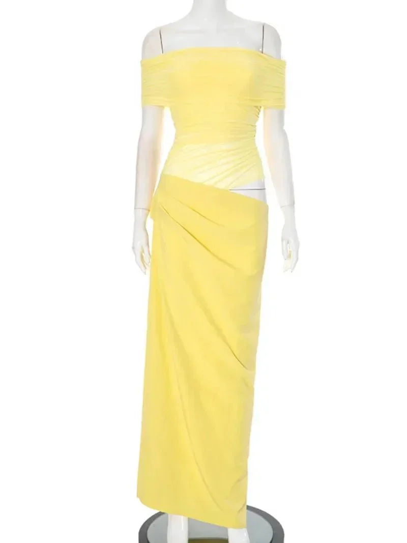 Design: A stylish and elegant yellow beach dress featuring an asymmetrical silhouette with a sultry slash neckline and off-shoulder. sleeveless design. The mesh patchwork and hollow-out details add a sexy and sophisticated touch. perfect for standing out on holiday or special occasions.