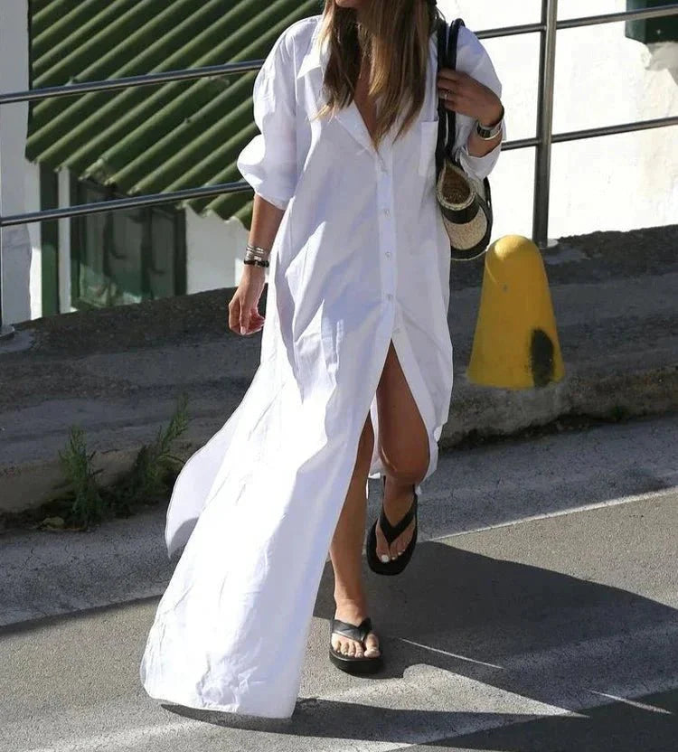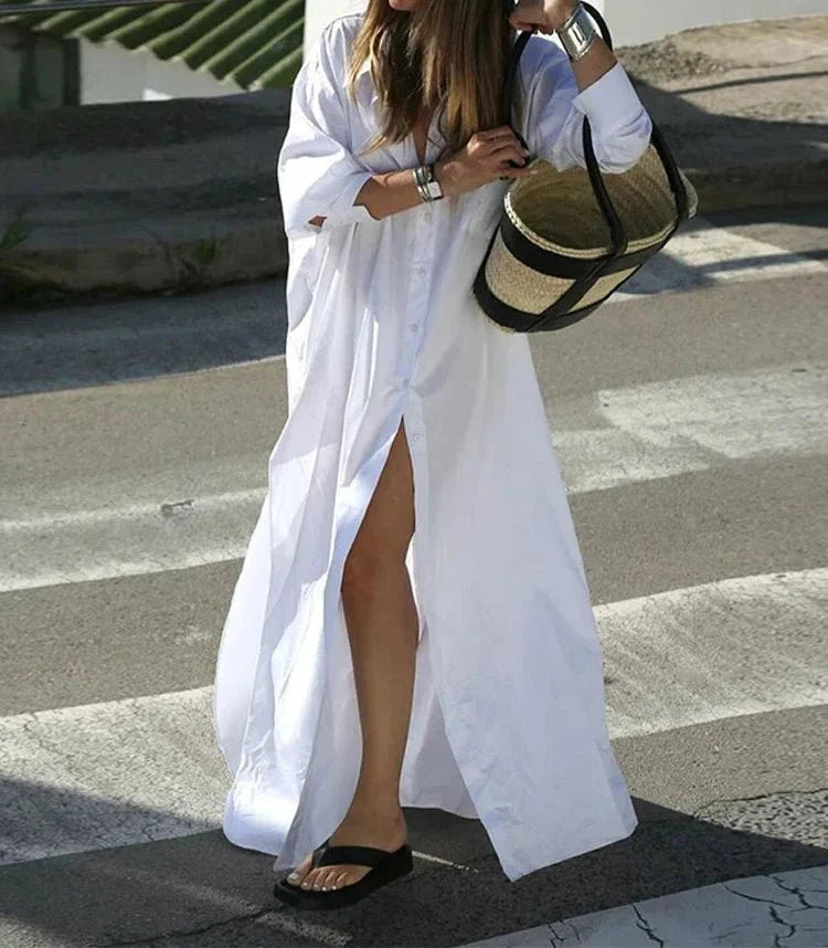 Step into elegance with this fashion-forward full sleeves long dress. Featuring a stylish turn-down collar and button decoration. this floor-length dress offers a loose fit and high-street appeal. Crafted from polyester. it's perfect for sophisticated occasions.