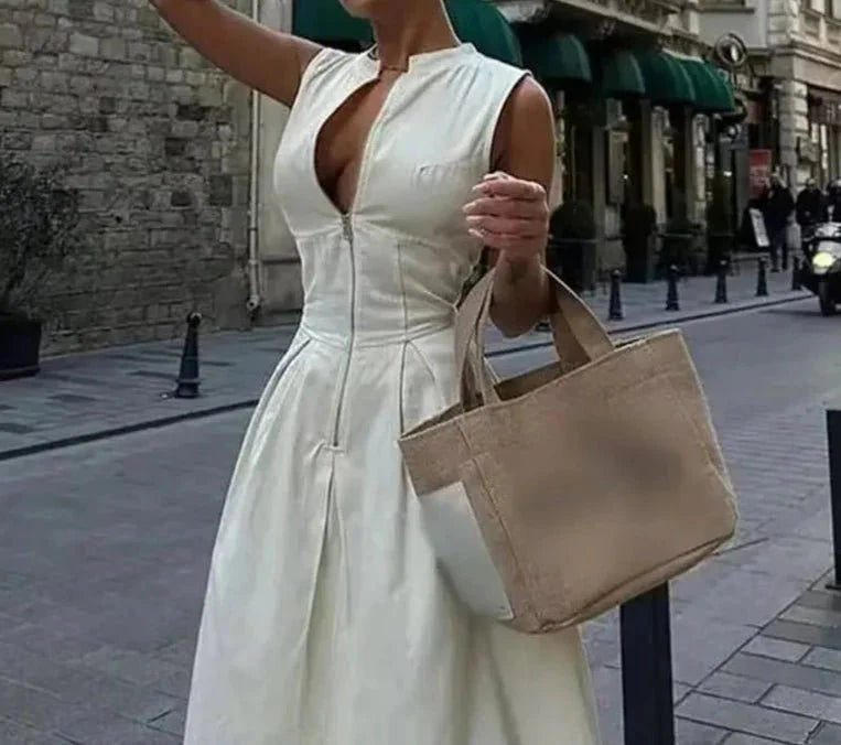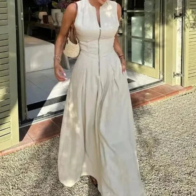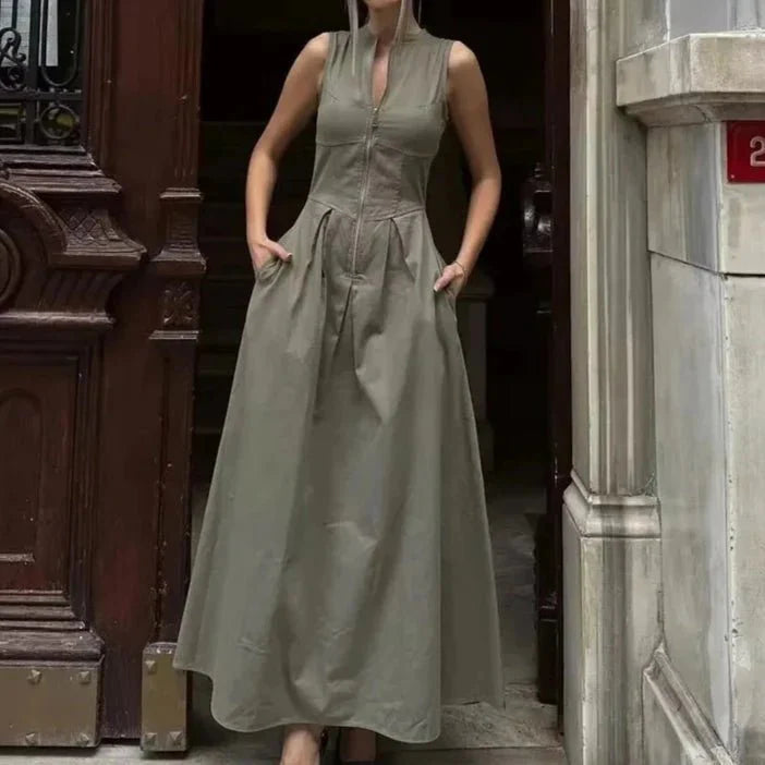 This stylish vacation dress combines casual elegance with a slim. straight silhouette. Made from non-stretch polyester fabric. it features a sleeveless tank design and a half high collar. giving it a sophisticated yet relaxed vibe. The dress is mid-calf length. offering a balanced look between comfort and chic. A zipper closure adds practicality while enhancing the modern aesthetic. Perfect for high street style. the solid pattern and natural waistline make this dress versatile for any occasion. Designed for a regular fit. it's an effortless choice for vacations or casual outings.