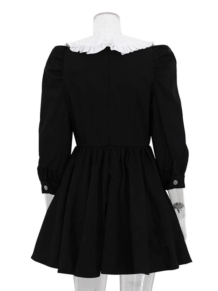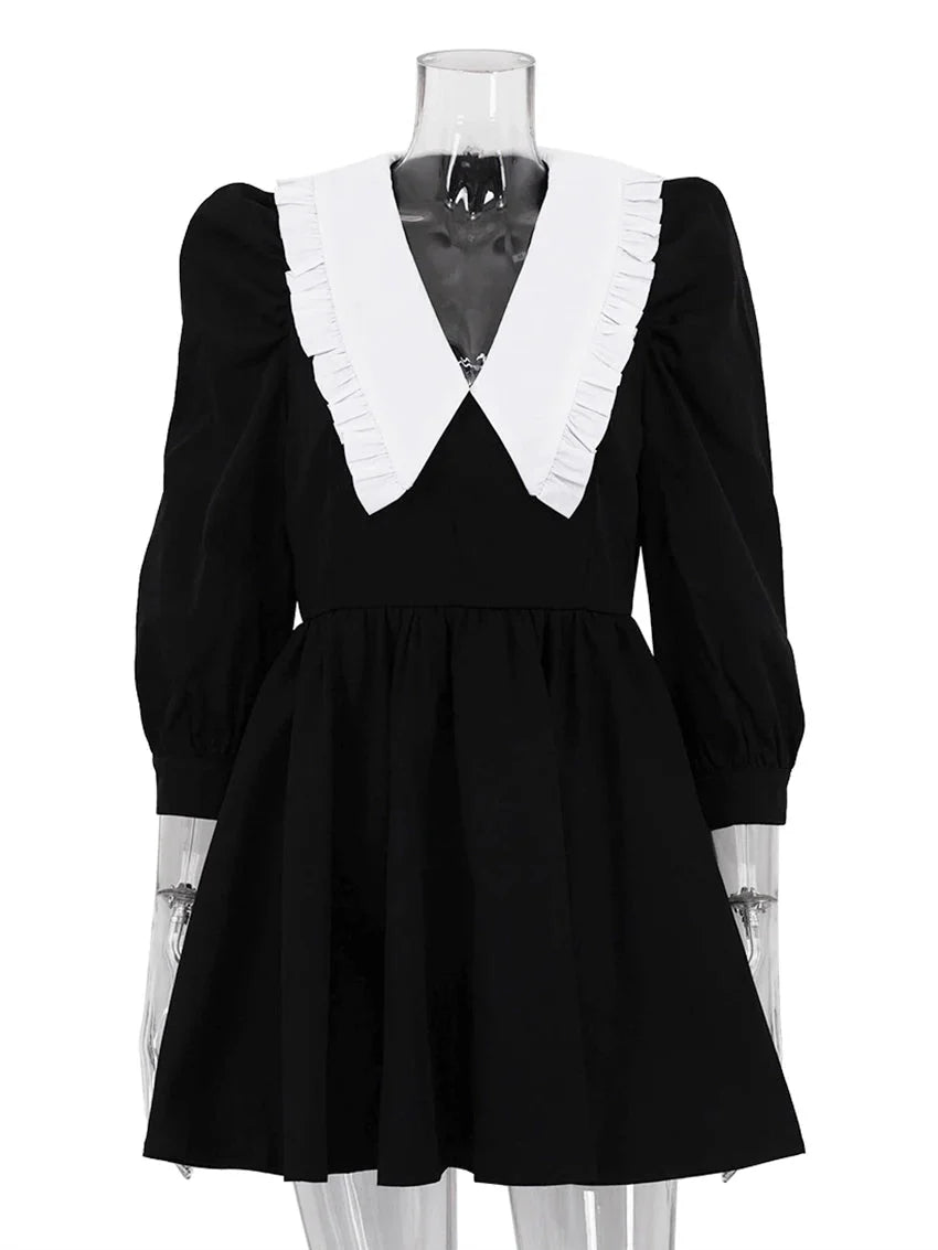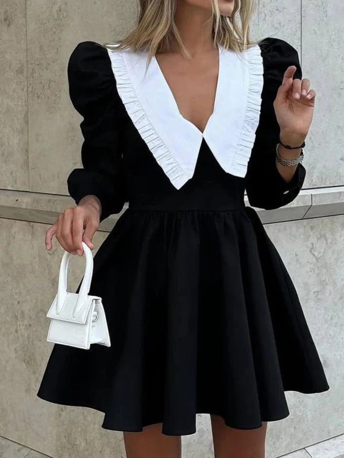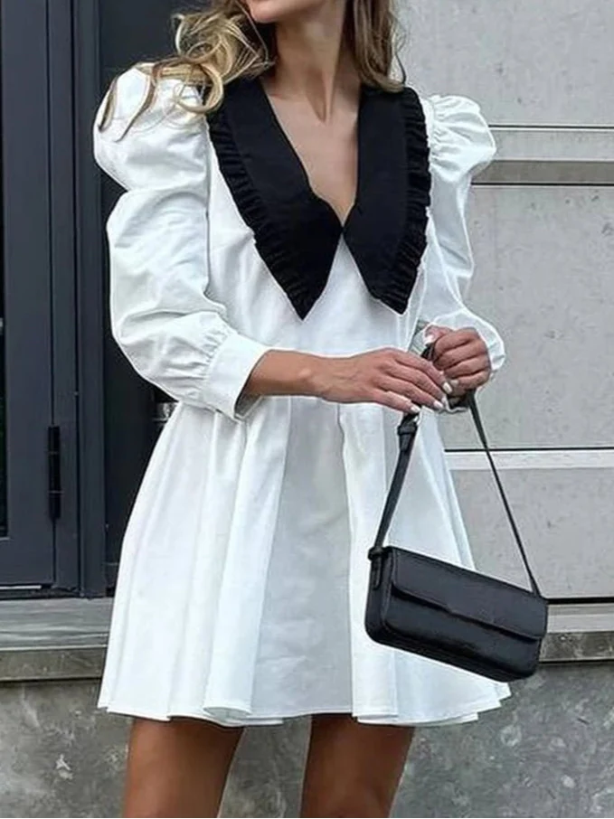 Design: A-line silhouette with a high-waist empire cut. pleated skirt. and modern patchwork details. creating a flattering and elegant look suitable for the office.