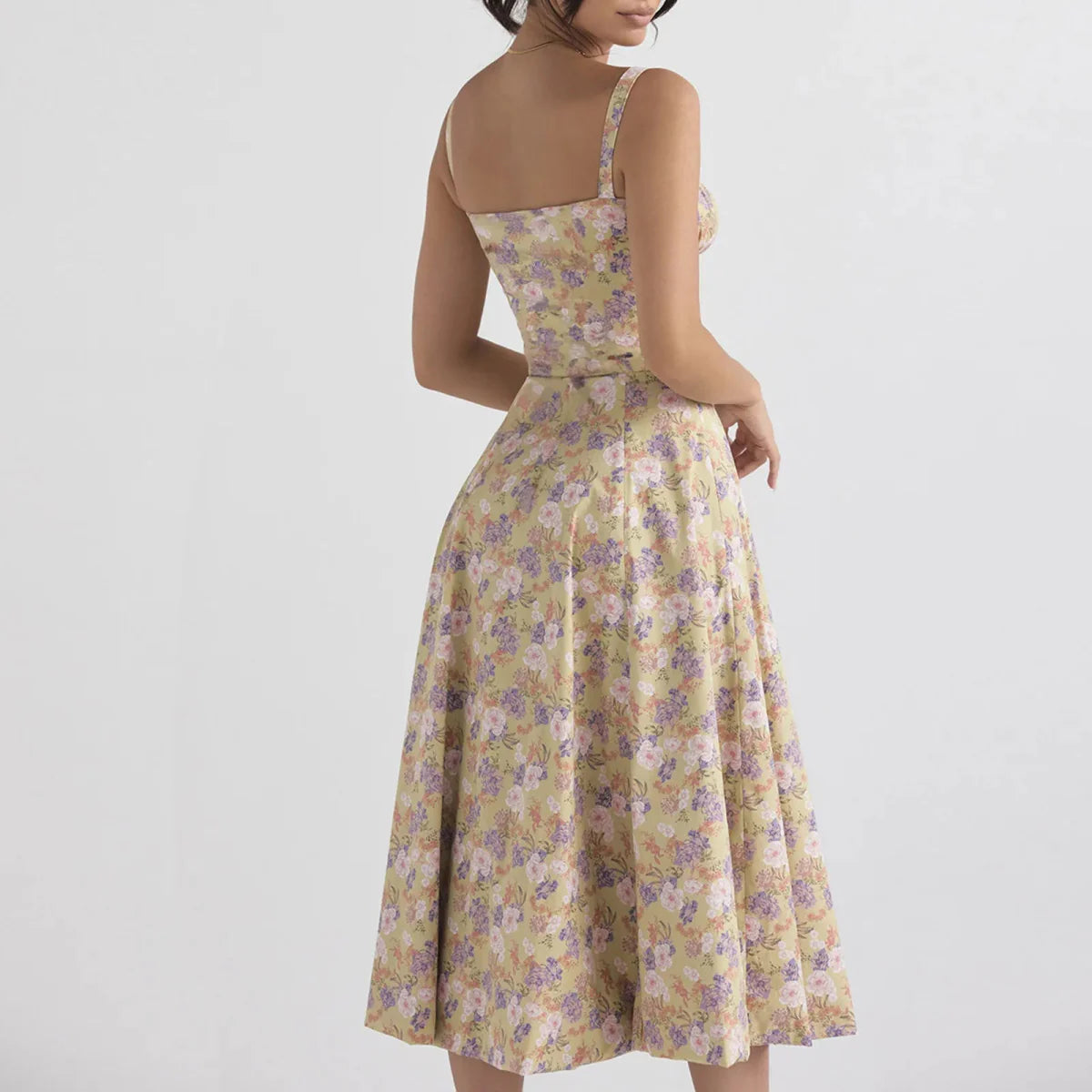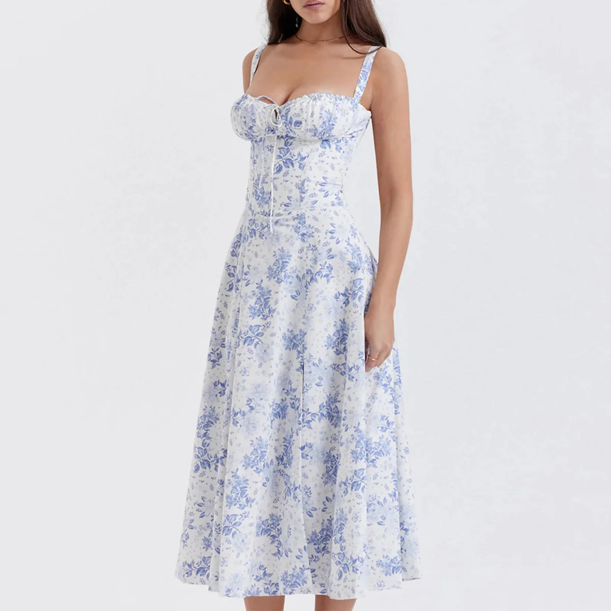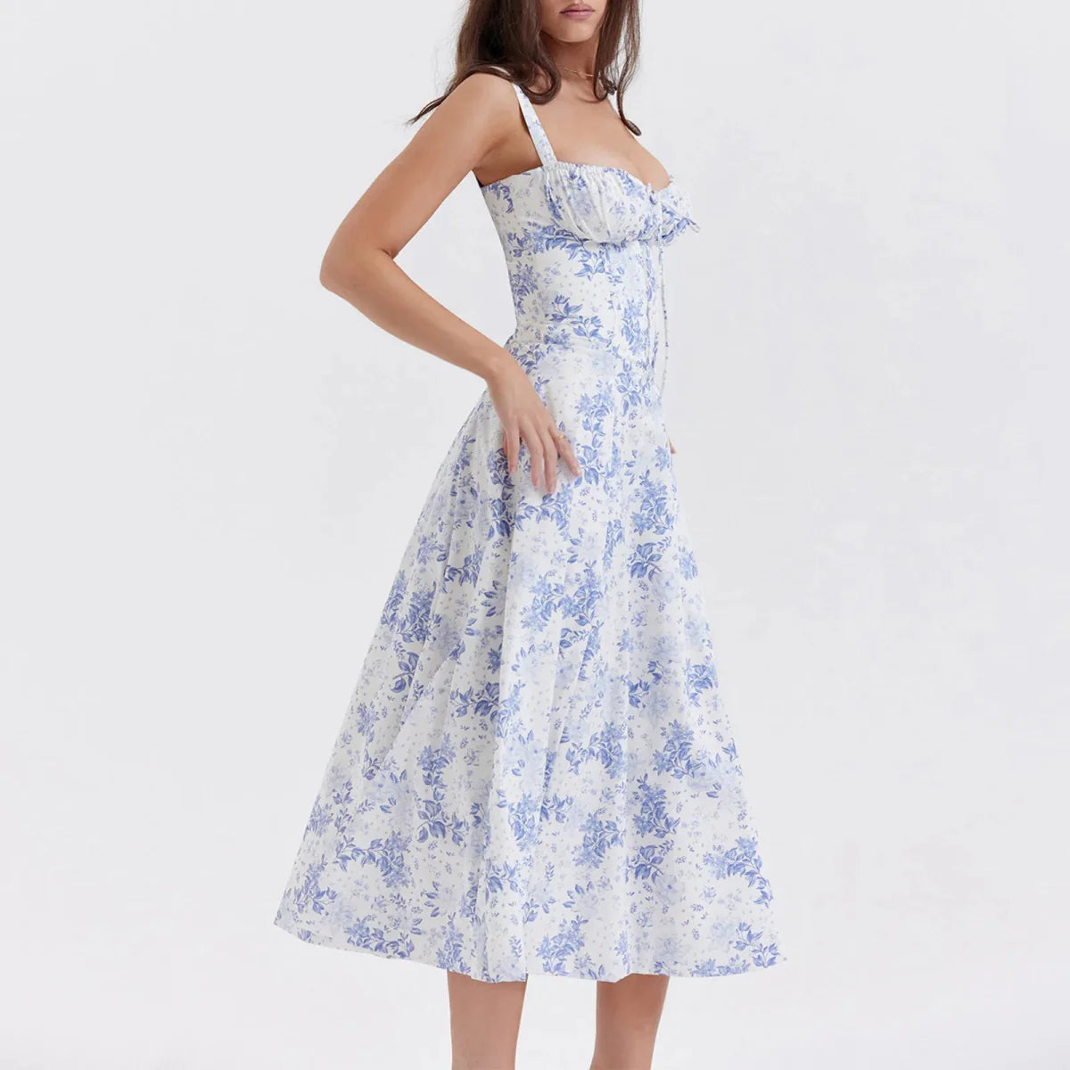 Design: A breezy floral print bustier dress featuring a strapless neckline and pullover closure. The loose silhouette and mid-calf length offer a carefree. effortless vibe perfect for summer days.