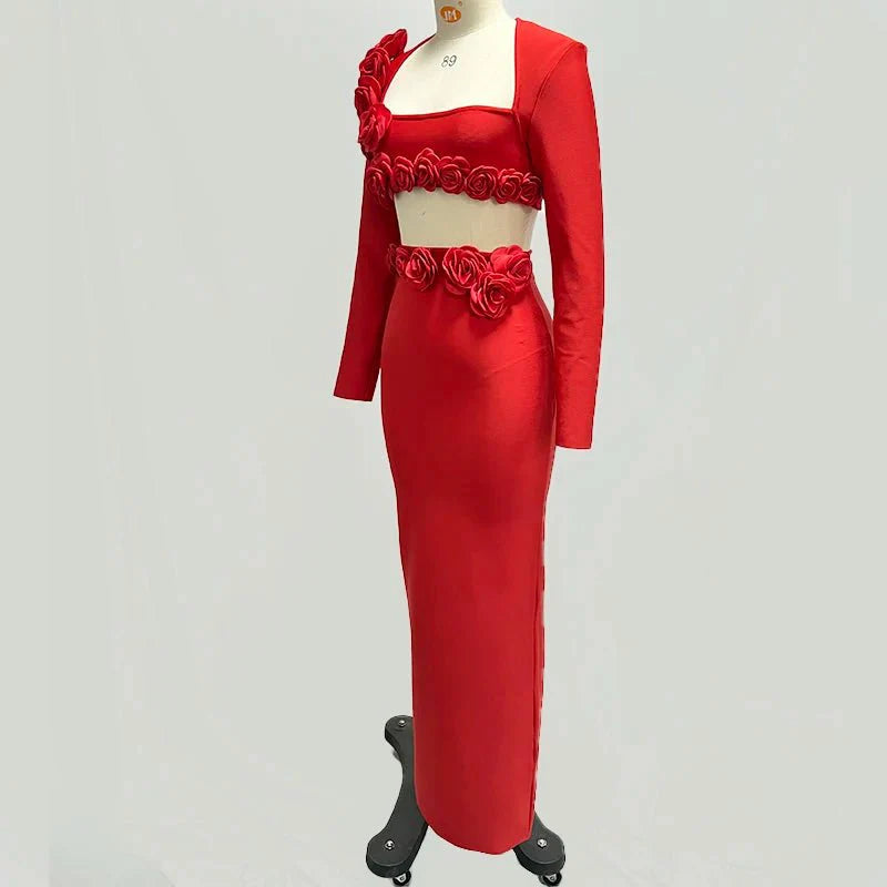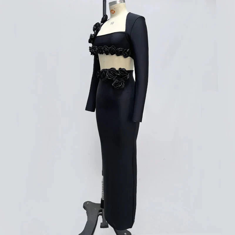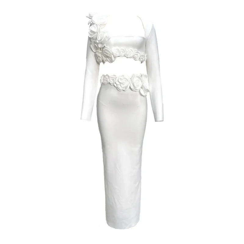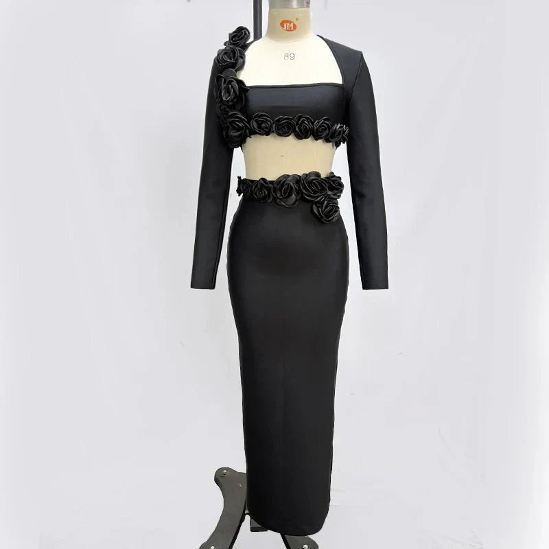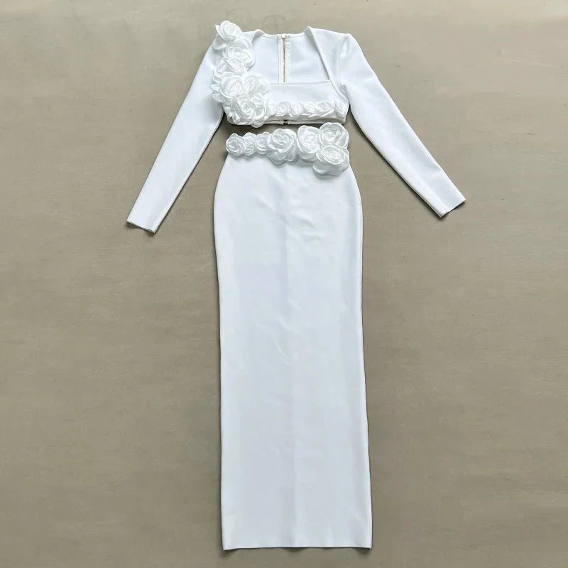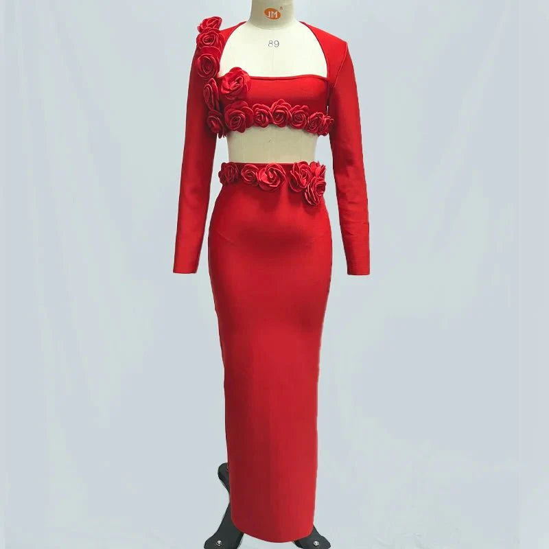 This elegant flower design set features a top jacket and mid-calf skirt with a sheath silhouette. Made from polyester with a knitted fabric. it has a square collar and full sleeves. The set is adorned with appliques for a stylish touch and secured with a zipper closure. perfect for formal or semi-casual occasions.