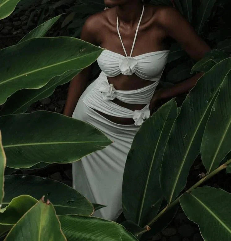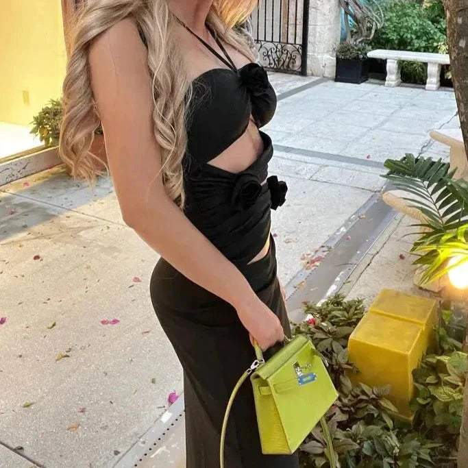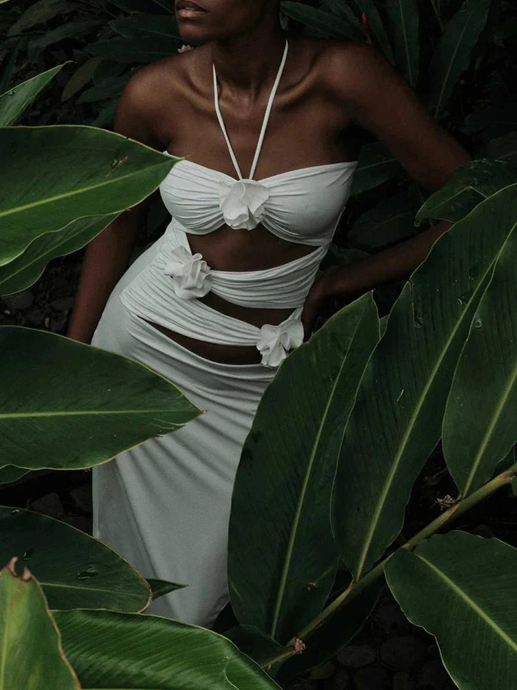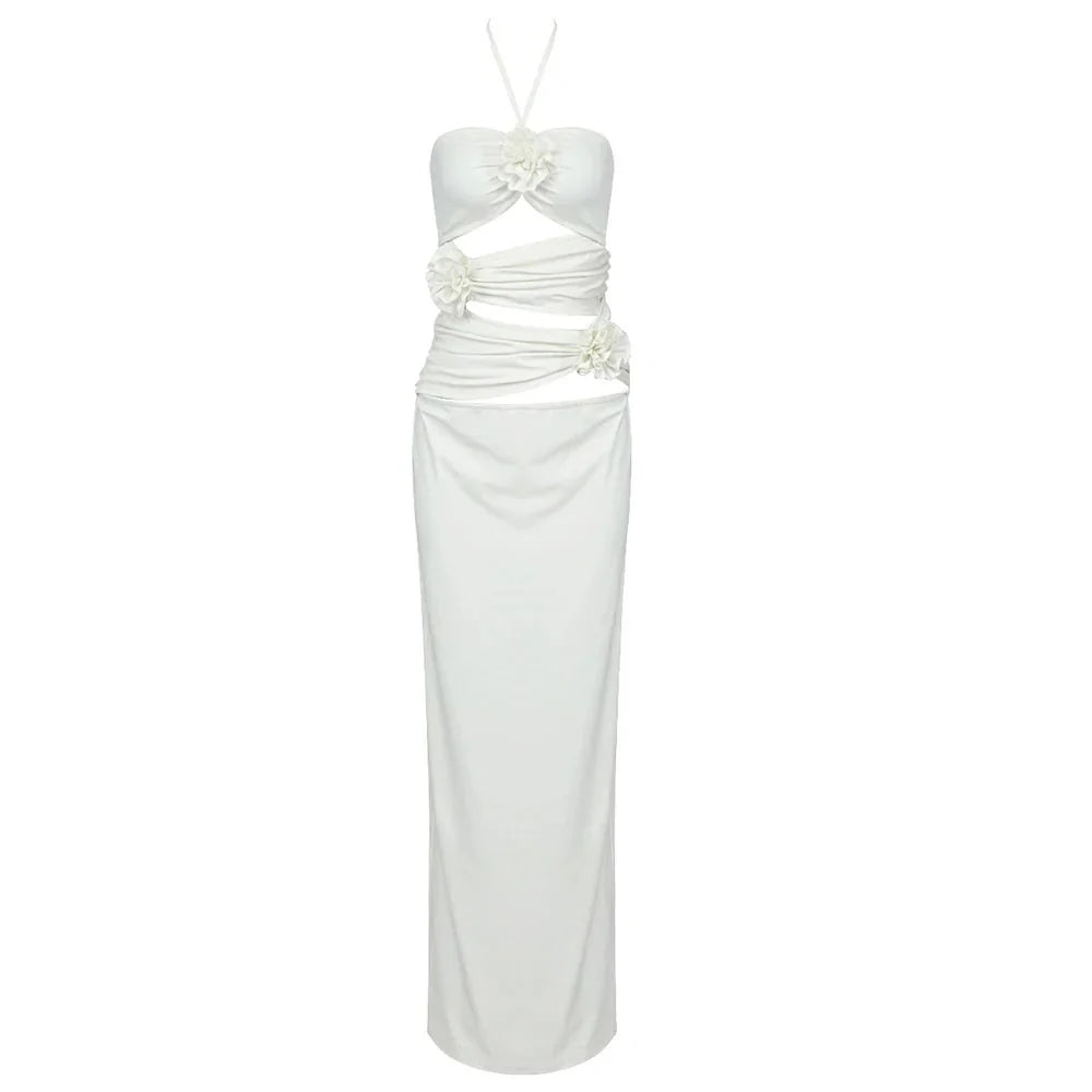 This sleeveless summer dress features a floral design with a halter neckline and hollow-out detailing. Made from a blend of cotton and polyester. it has a slim fit and sheath silhouette. The ankle-length dress offers a sexy club style with an empire waistline. perfect for summer events. Non-stretch viscose fabric adds a refined touch.