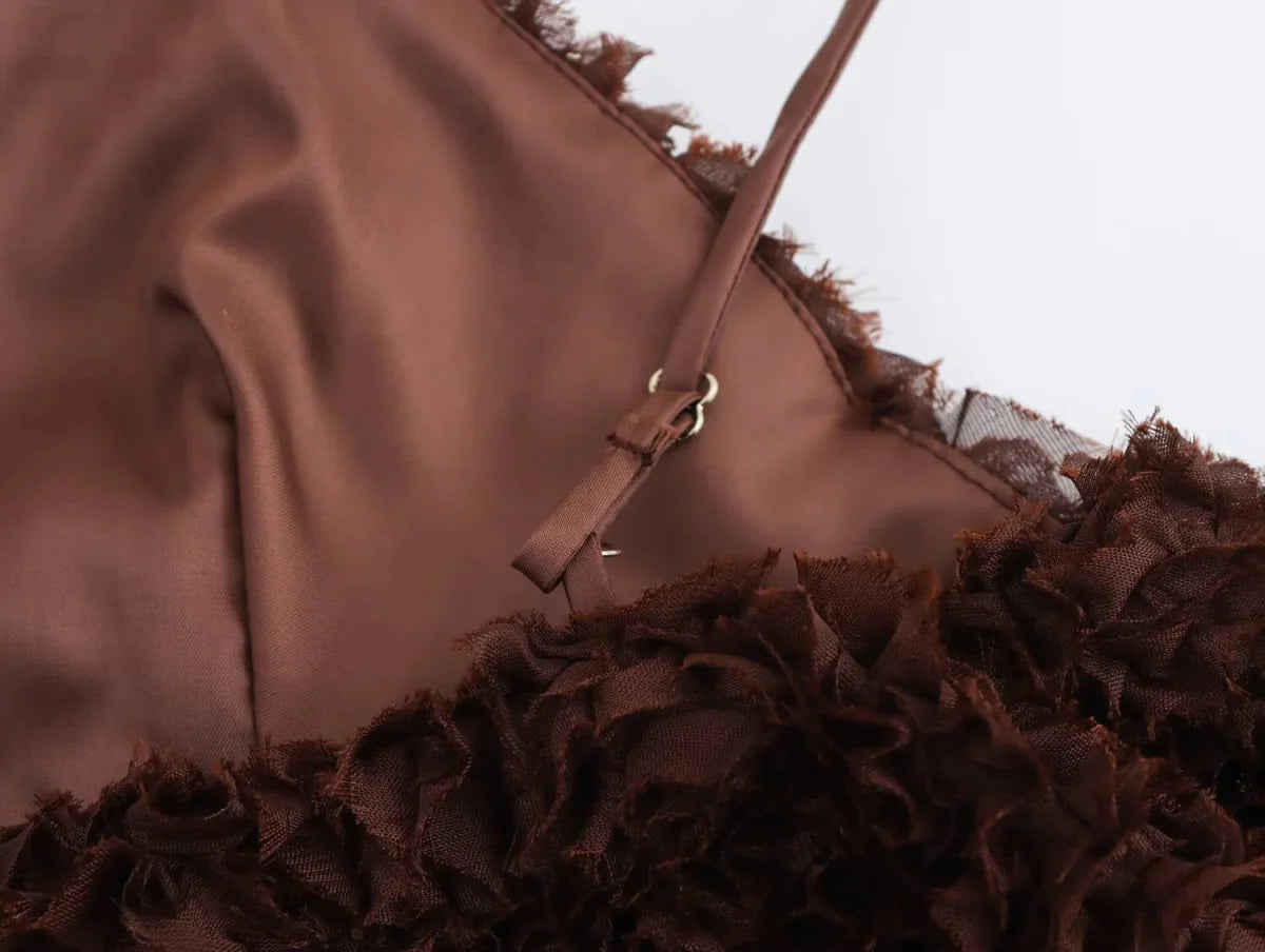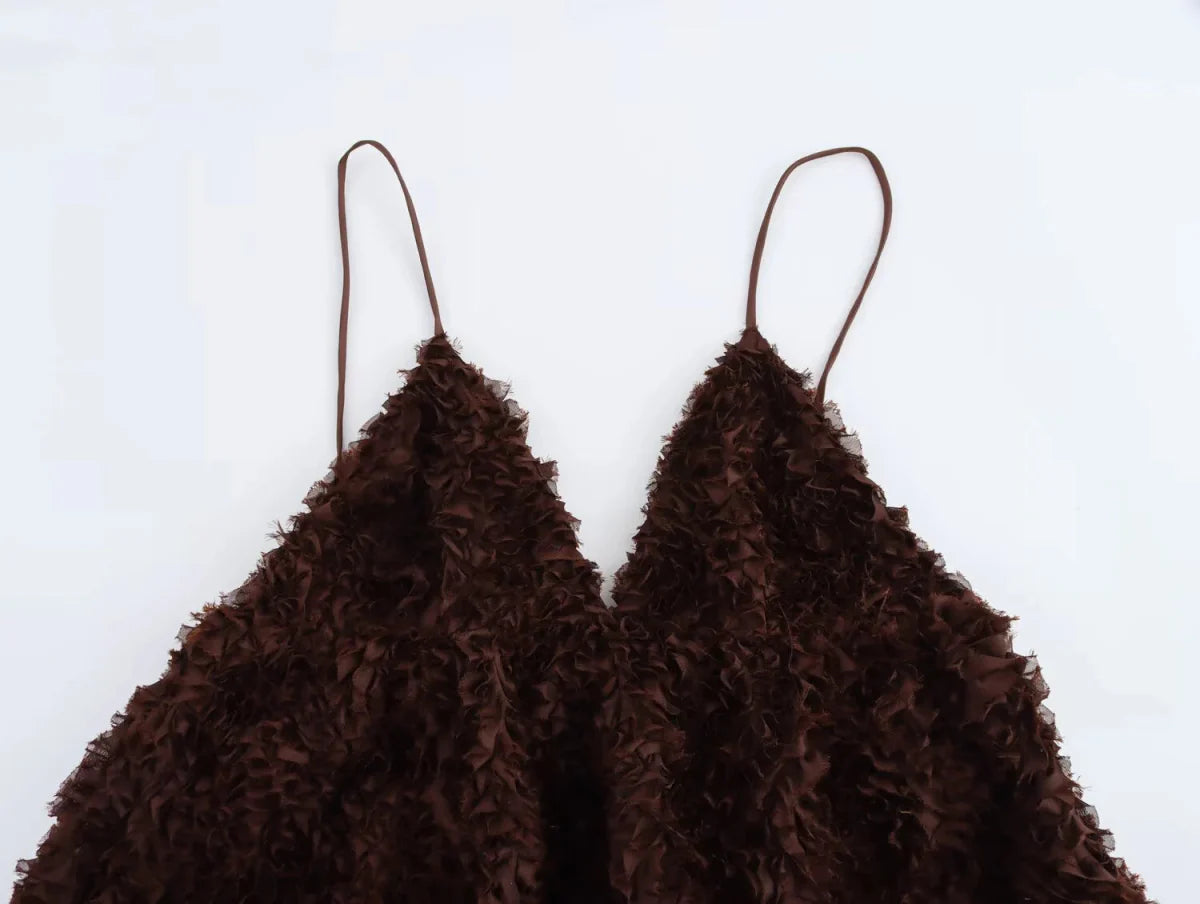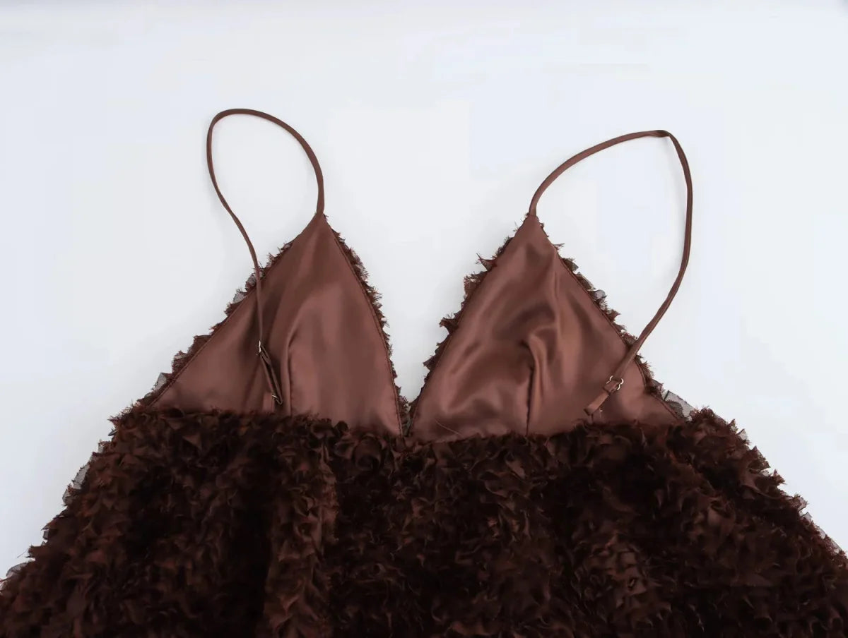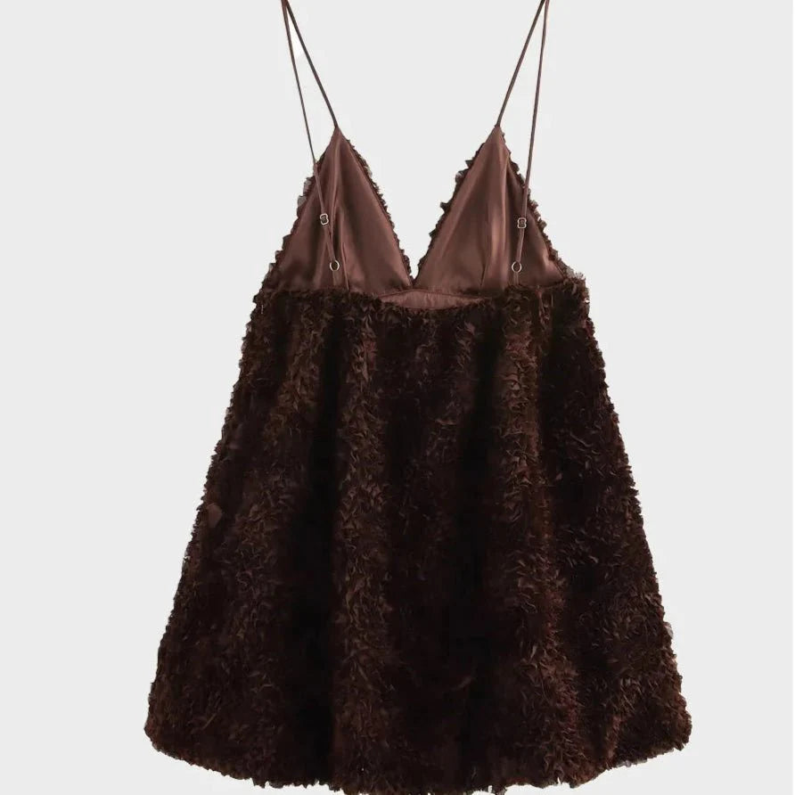 Design: A playful and chic mini dress featuring a V-neckline. spaghetti straps. and a voluminous ball gown silhouette. The fluffy mesh adds a touch of whimsy. while the pullover closure ensures easy wear.