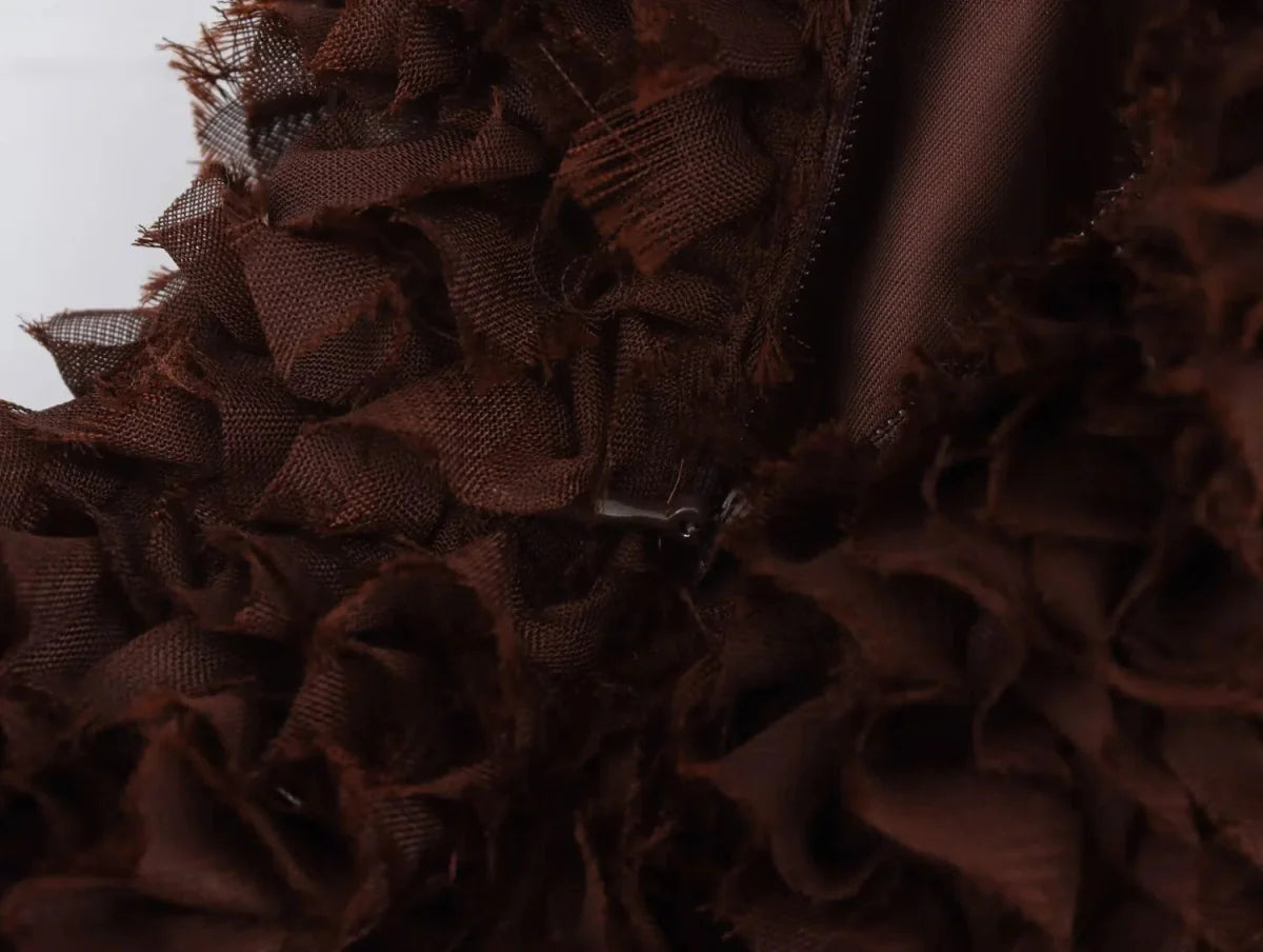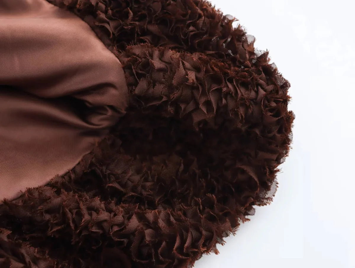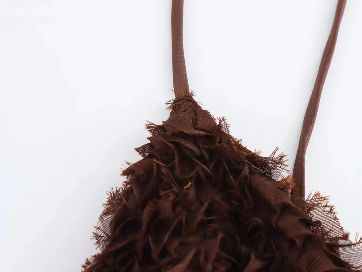 Design: A playful and chic mini dress featuring a V-neckline. spaghetti straps. and a voluminous ball gown silhouette. The fluffy mesh adds a touch of whimsy. while the pullover closure ensures easy wear.