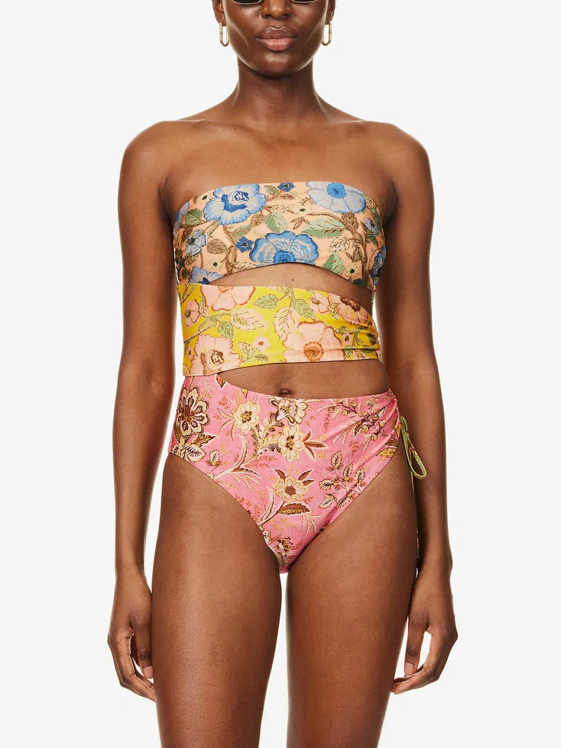 This swimsuit features daring cut-outs and lace-up detailing making it feminine. floral and sensual.