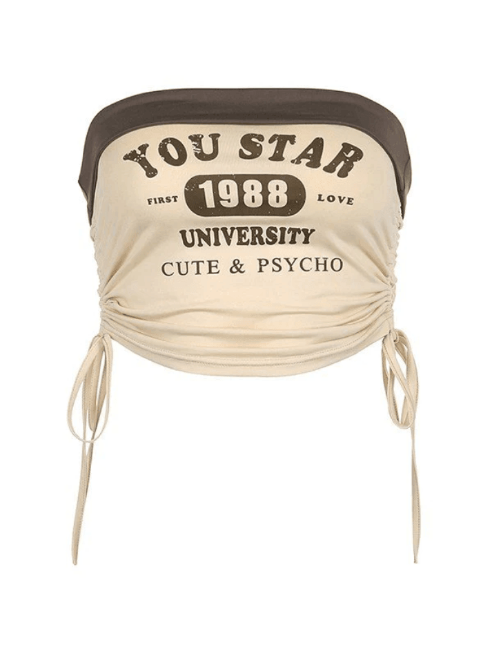 Description: Elevate your fashion game with this cute and chic patchwork bandeau top. Designed for the trendy Gen Z crowd. it effortlessly combines various styles like casual. street. Y2K. sweet. sexy. vintage. punk. and hip pop. Crafted from a soft and stretchy fabric. this top features a unique contrast paneled design through the collar. It showcases a stylish logo pattern print and offers a drawstring tie side fastening for adjustable length. Whether you're heading out for a night on the town or attending a holiday festival. this versatile tube top is a must-have for creating fashion-forward street outfits. Stand out from the crowd with this upgraded tube top that adds a touch of flair to any ensemble.
