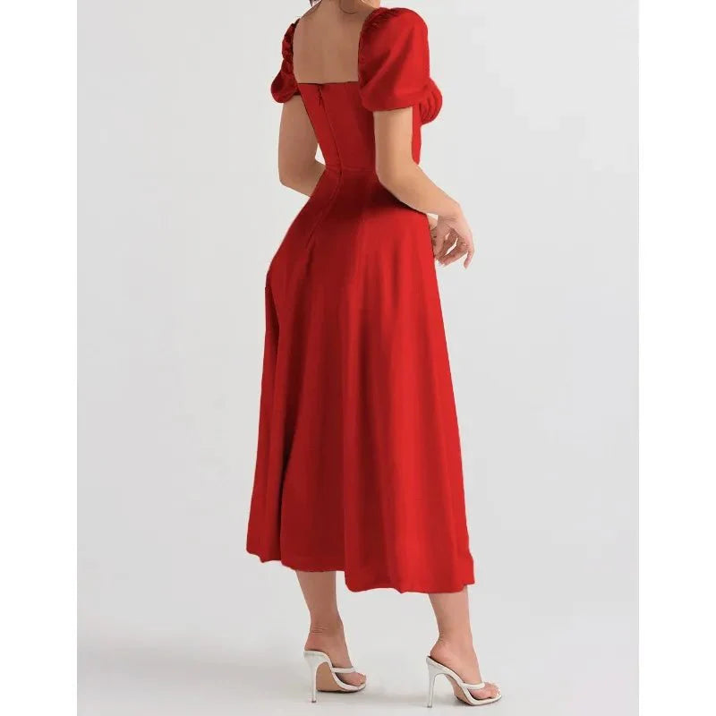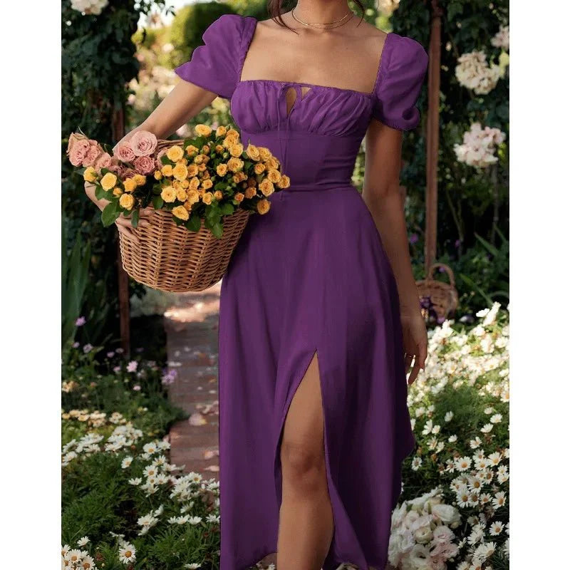 Design: A charming A-line dress with a flattering square neckline. puff sleeves. and a feminine lace-up detail. The high-waisted silhouette and side slit add elegance and ease. making it a stylish warm-weather staple.