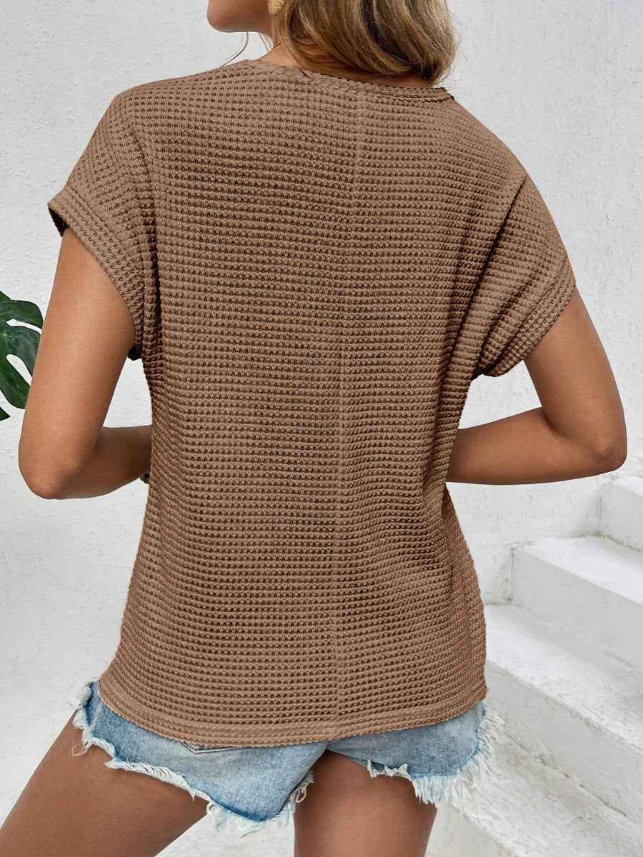 This top features a mesh hollow-out design. enhancing breathability and ventilation. ensuring the wearer stays cool and comfortable even in hot weather. With its solid color and textured fabric. it embodies a simple yet stylish look. adding a touch of delicacy and quality. The drop-shoulder sleeves provide a loose and relaxed fit. offering enhanced comfort and a casual vibe. Its classic round neckline is versatile and easy to pair with different bottoms. Overall. the loose cut makes it suitable for everyday wear. showcasing a laid-back and effortless style.