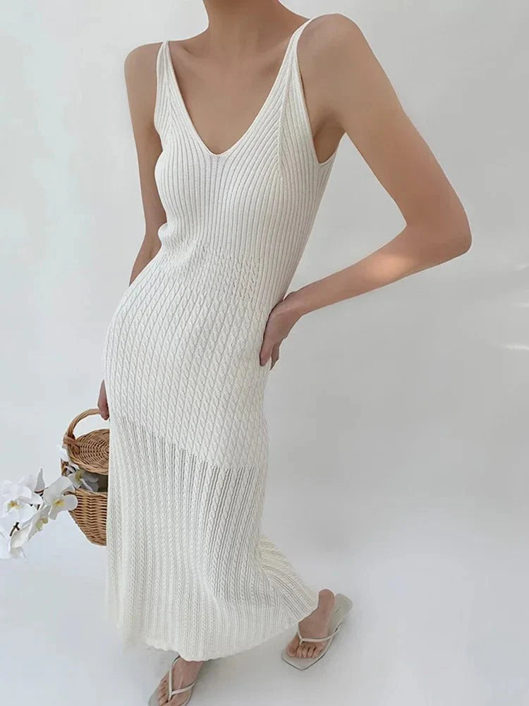 Design: A minimalist ankle-length dress featuring a sleek V-neckline and sleeveless cut. designed with clean lines and a straight silhouette for timeless sophistication.