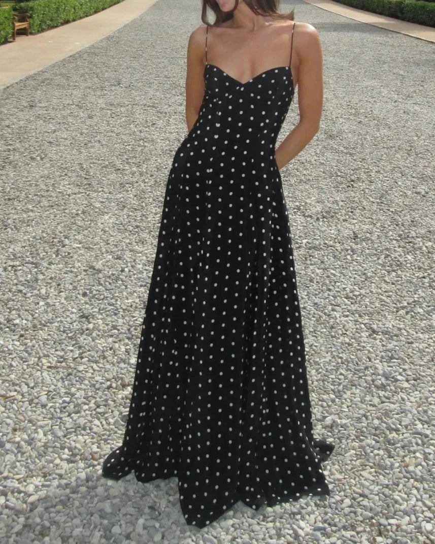 Step out in style with the Polka Dot Printed Maxi Dress. a perfect choice for summer. This high-street dress features a playful polka dot pattern and a classic V-neckline. adding a fun yet elegant touch to your look. Made from lightweight polyester. the dress offers a regular fit with a straight silhouette that flows beautifully to ankle length. Designed with spaghetti straps and a chic backless detail. this camisole-style dress is ideal for warm weather. The empire waistline flatters your figure. while the pullover closure ensures easy wear. Embrace effortless fashion with this versatile. sleeveless maxi dress.