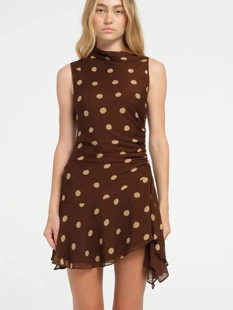 Design: A playful polka dot ruched dress with a diagonal collar and mini length. The A-line silhouette and sleeveless design make it perfect for spring and summer casual wear.