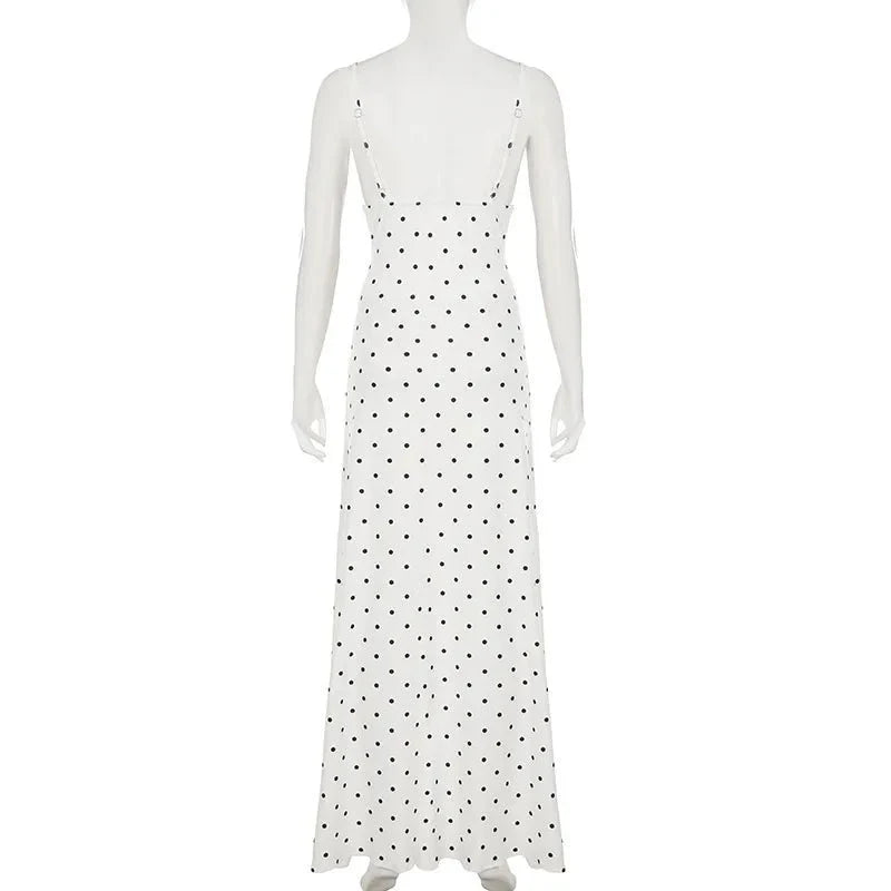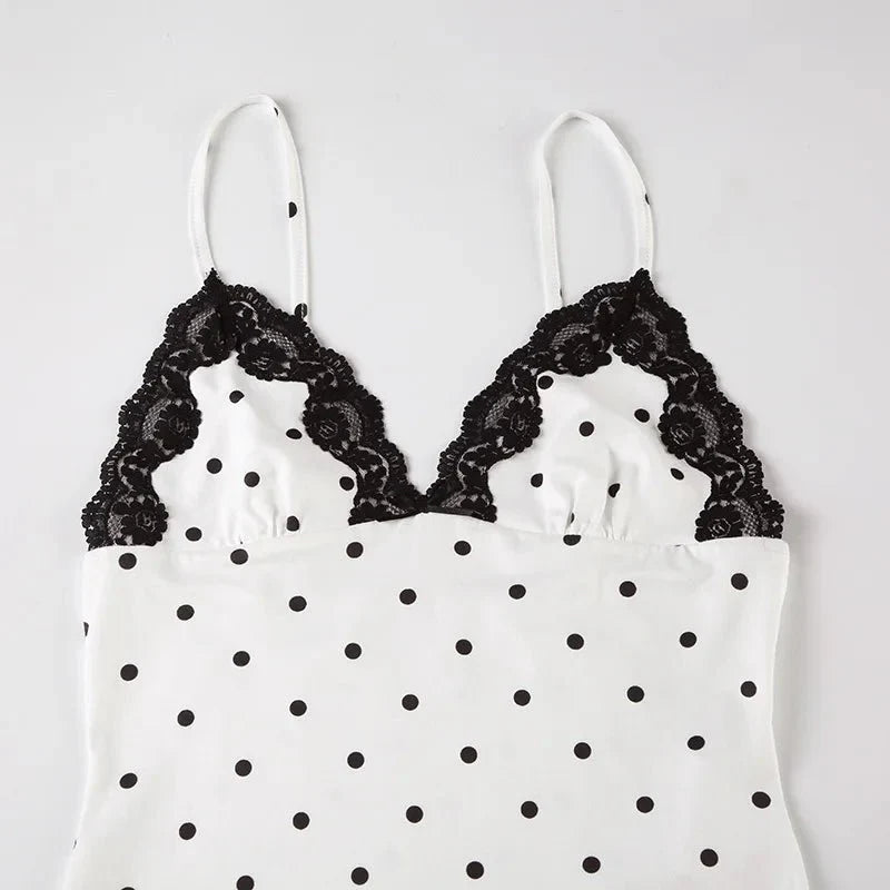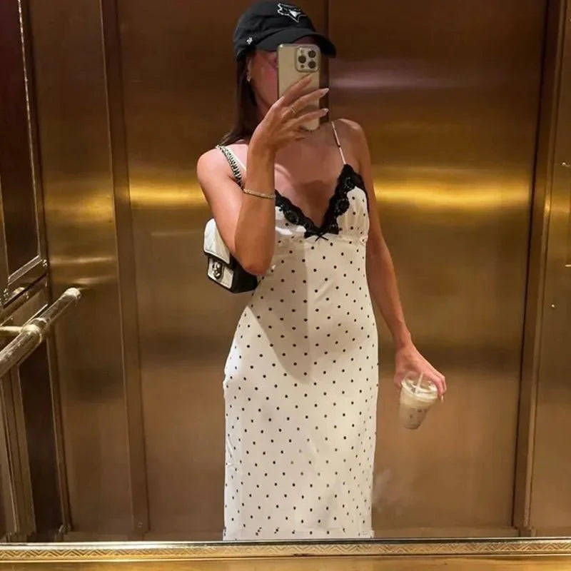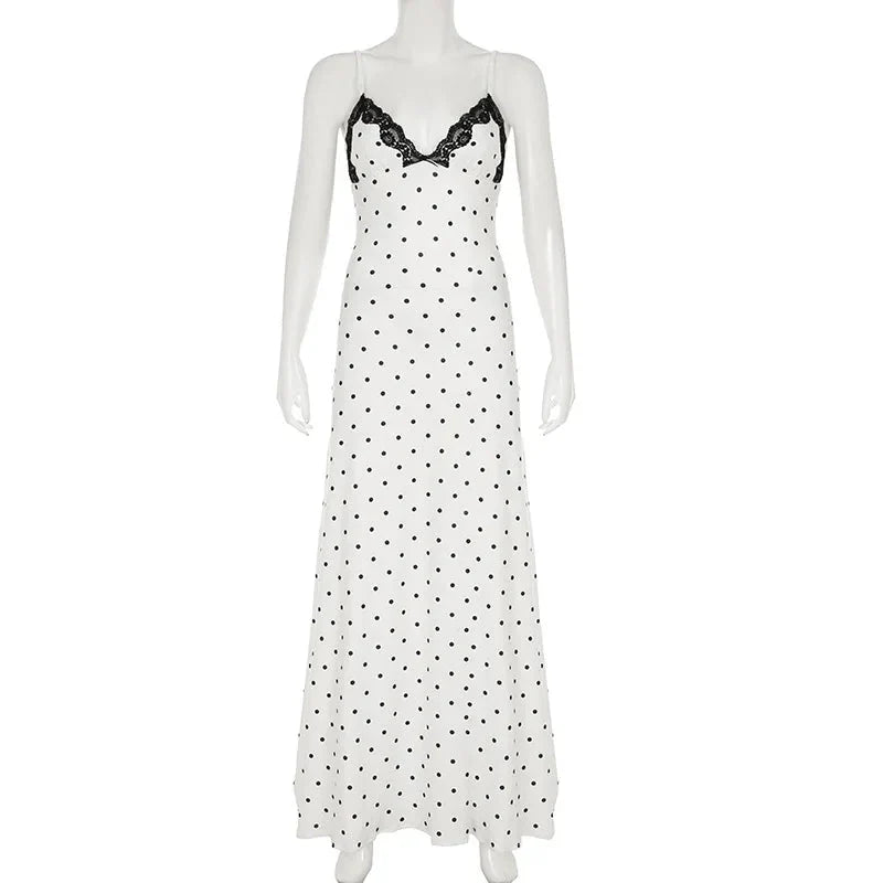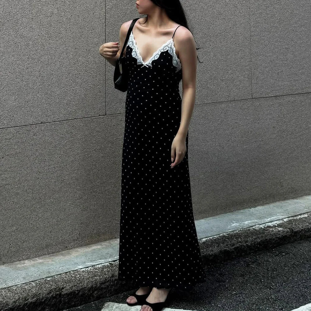 Design: A chic polka dot sleeveless long dress featuring a stylish lace decoration. The ankle-length dress has a straight silhouette with a natural waistline. perfect for creating a sophisticated yet casual look.