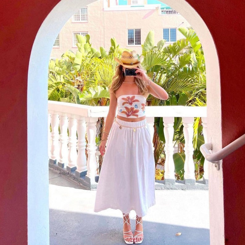 Get ready for spring and summer with our Reese Floral Print Strapless Top! This white top features a sleeveless design and a trendy crop cut. Whether you're going for a sexy or casual look. this tube top has got you covered (or not) in style. Part of our IFOMT Spring-Summer Collection.