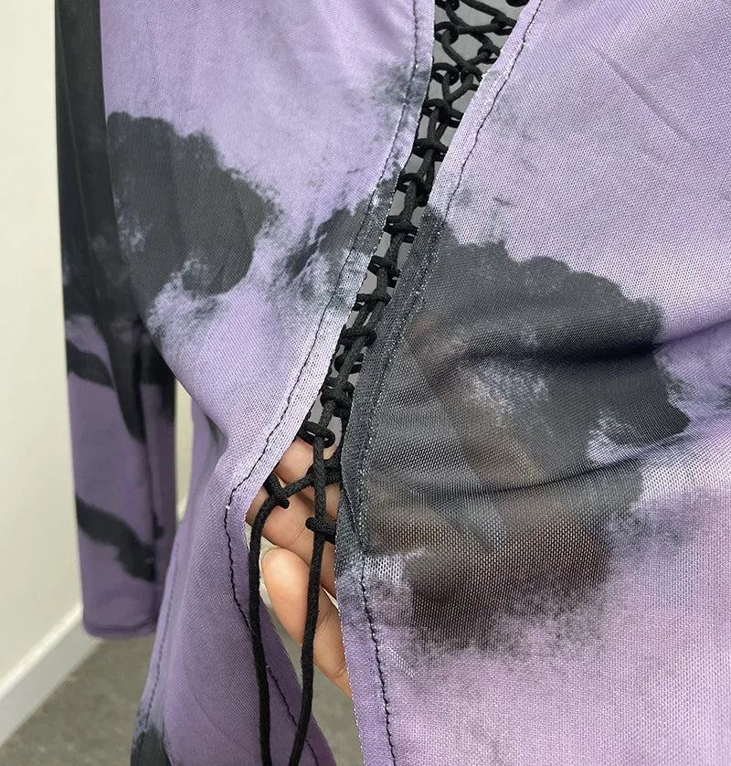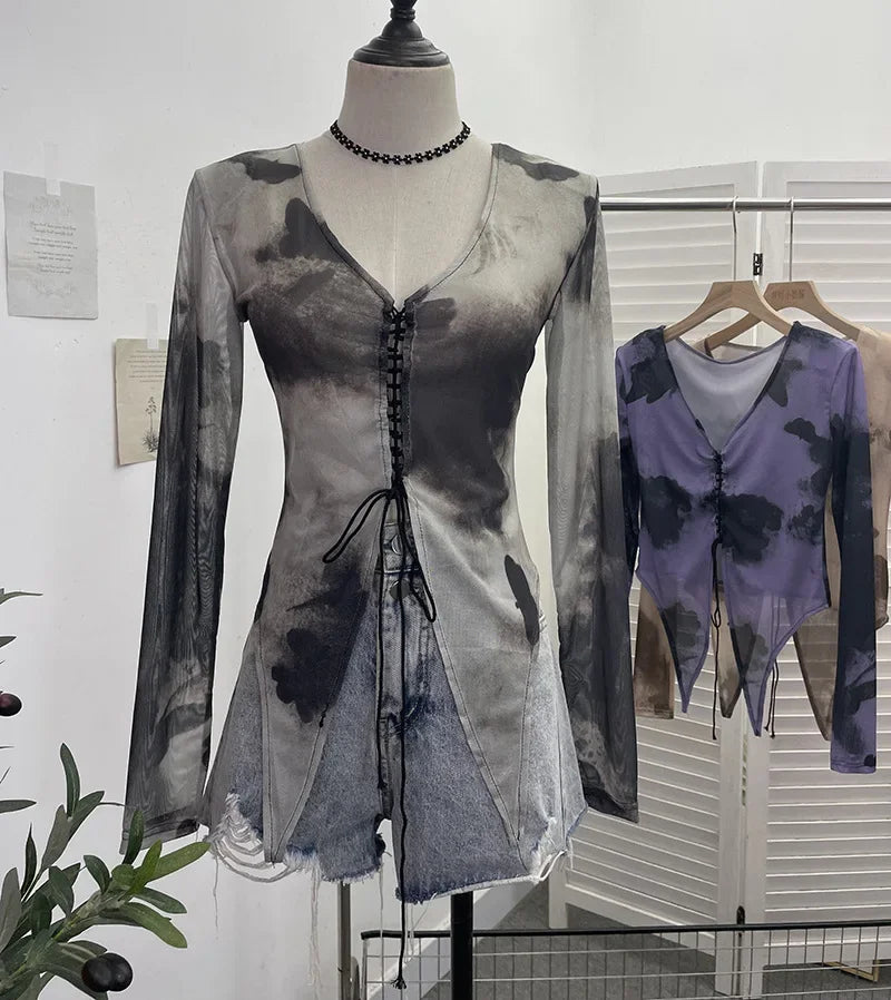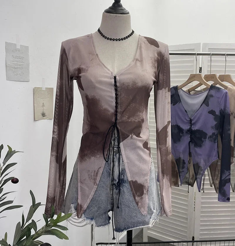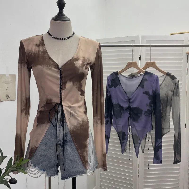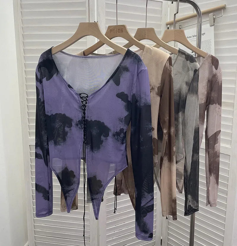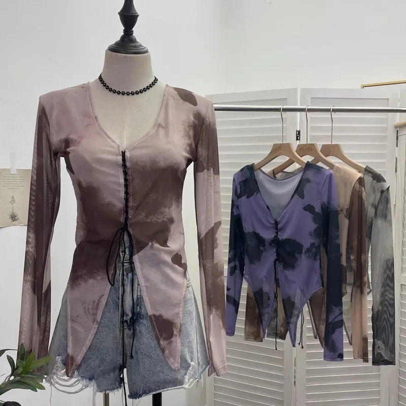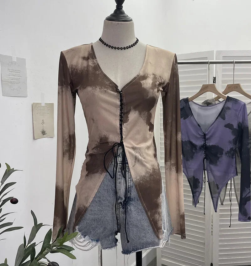 Pydshop Retro Hot Girl Tie Dye Printed Long Sleeve Shirt V-neck Lace Up Irregular Shoulder Pads T-shirt Short Top Casual Streetwear 2622