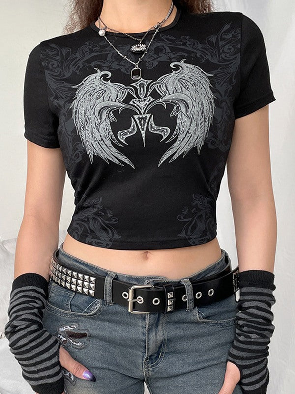 Description: These darkness graphic summer baby tees shaped to a tightening silhouette. with a crop length. features grunge wing pattern print with rhinestone decors on it.