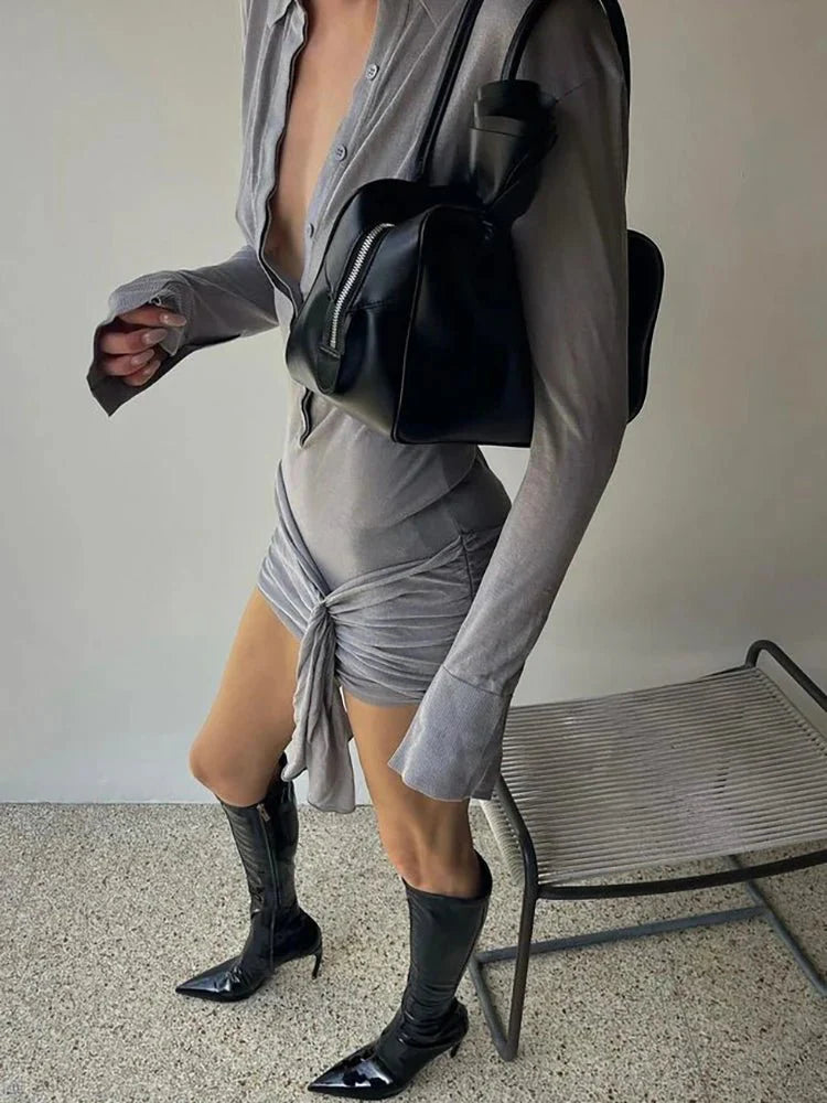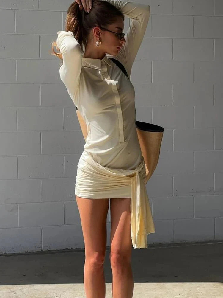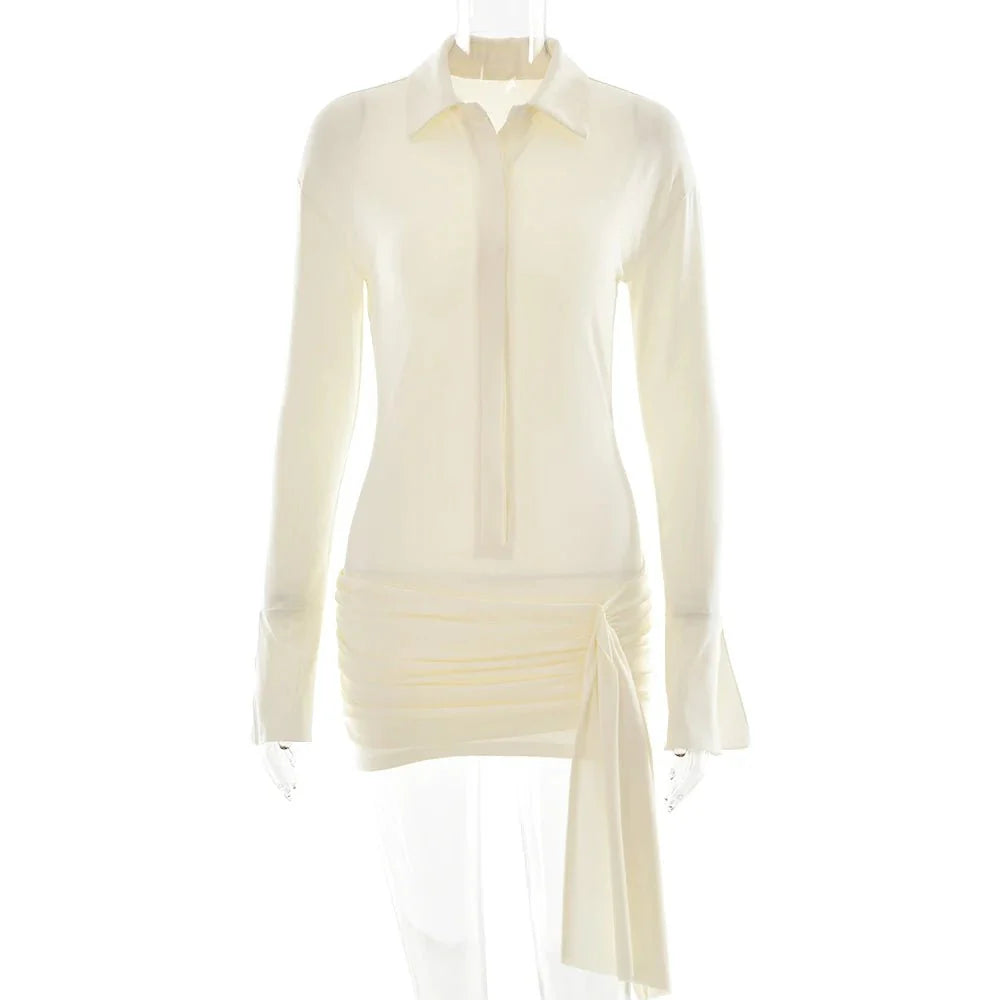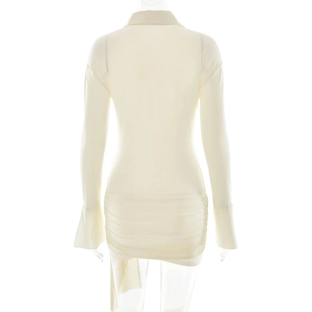 Design: An eye-catching mini shirt dress with a ruched bandage design. sharp turn-down collar. and flattering single-breasted front. The slim fit and streamlined shape result in a refined yet bold look that's perfect for a party.