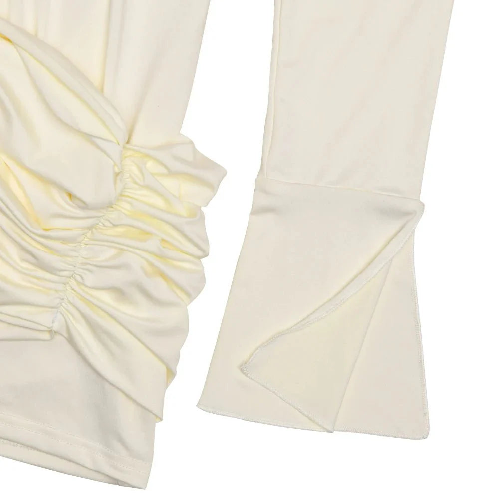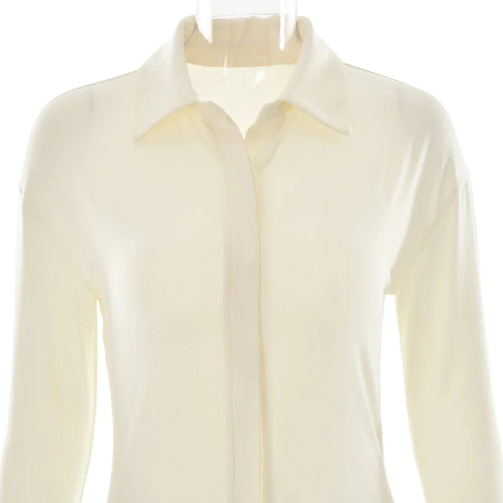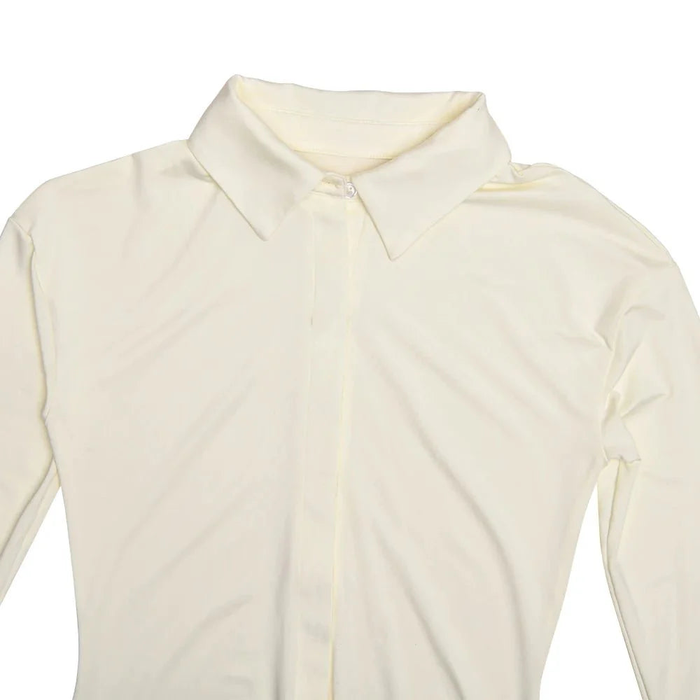 Design: An eye-catching mini shirt dress with a ruched bandage design. sharp turn-down collar. and flattering single-breasted front. The slim fit and streamlined shape result in a refined yet bold look that's perfect for a party.