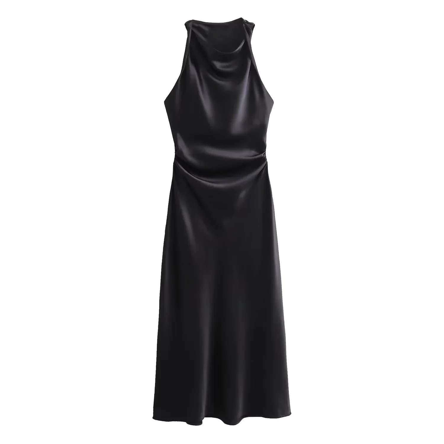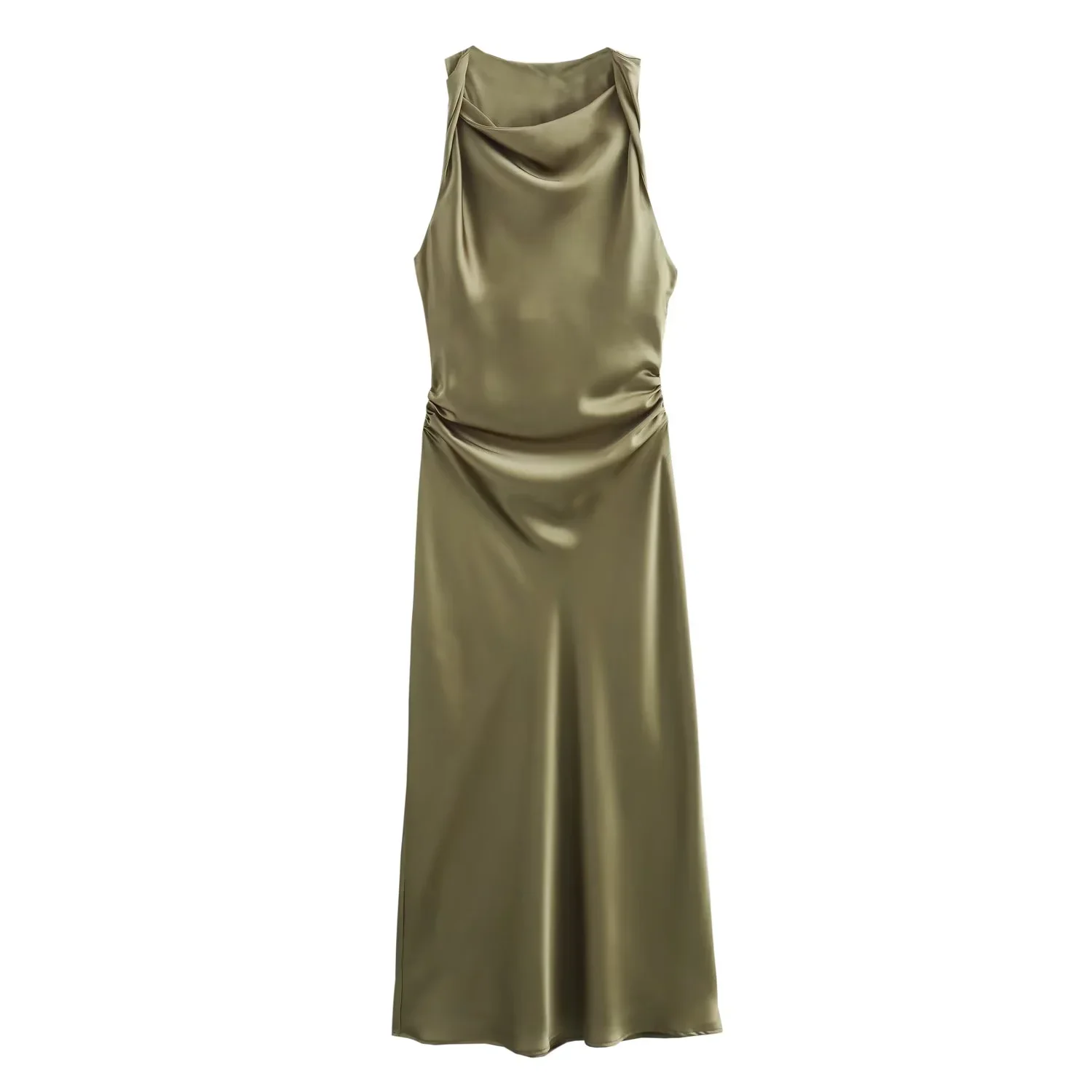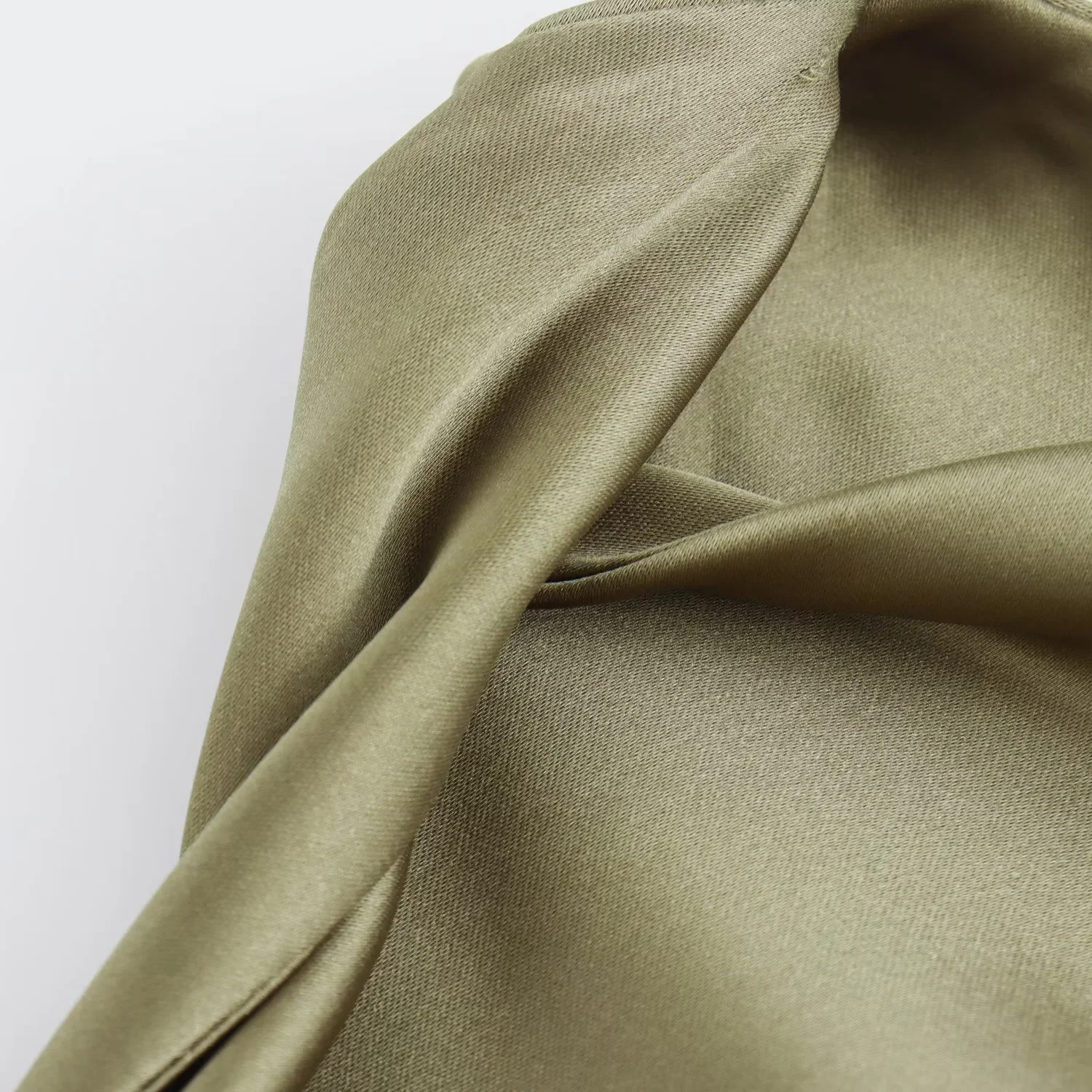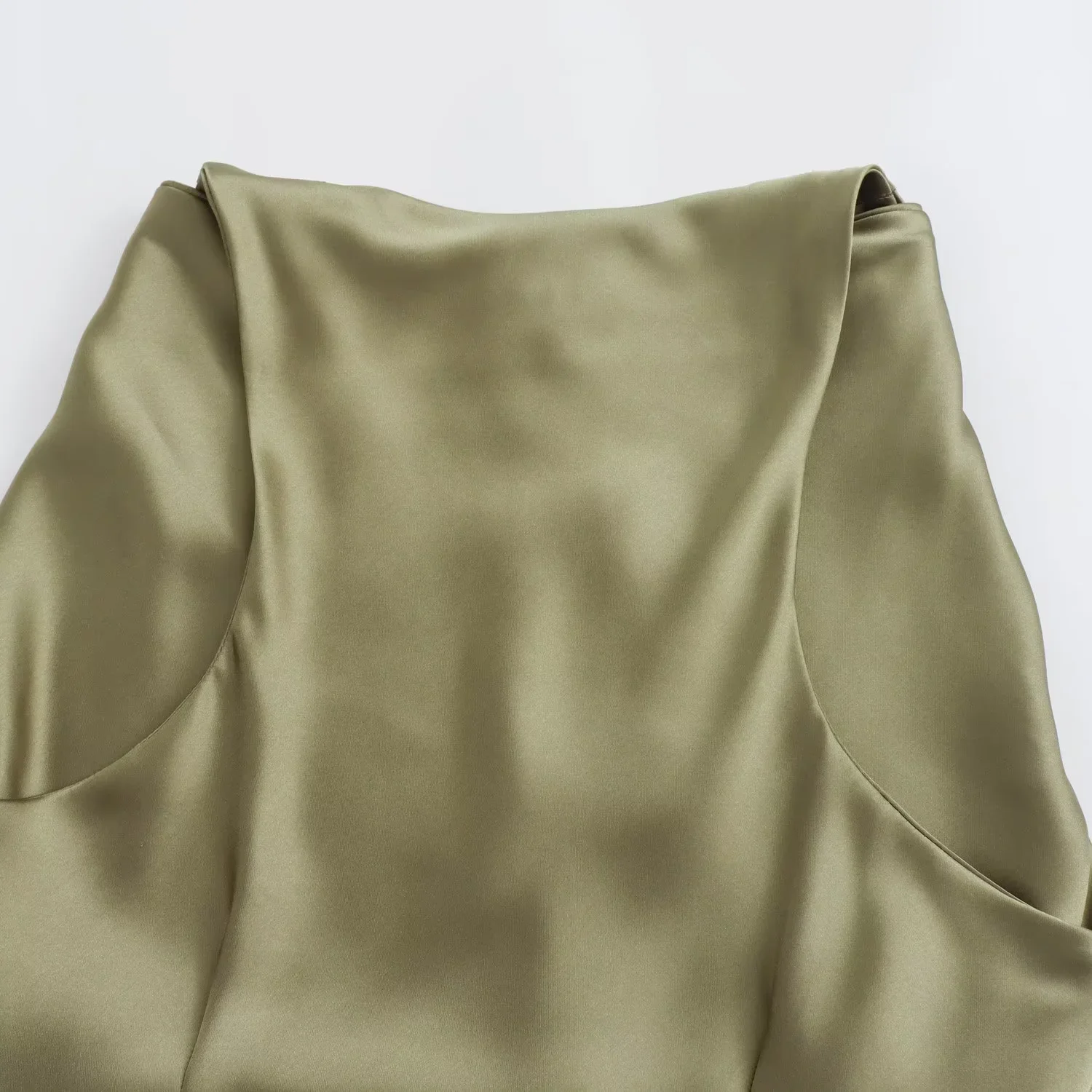 Design: A chic ruched satin midi dress featuring a square collar and off-shoulder design. The sleek. straight silhouette enhances your figure while adding a touch of sophistication and elegance.