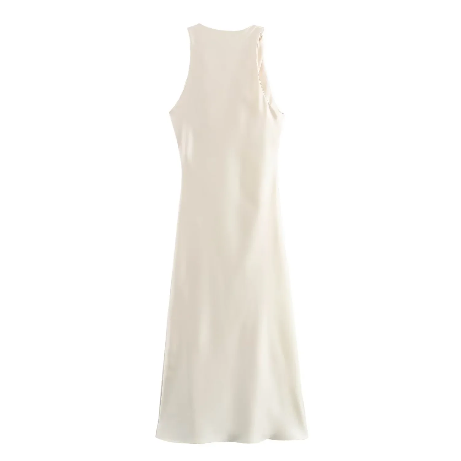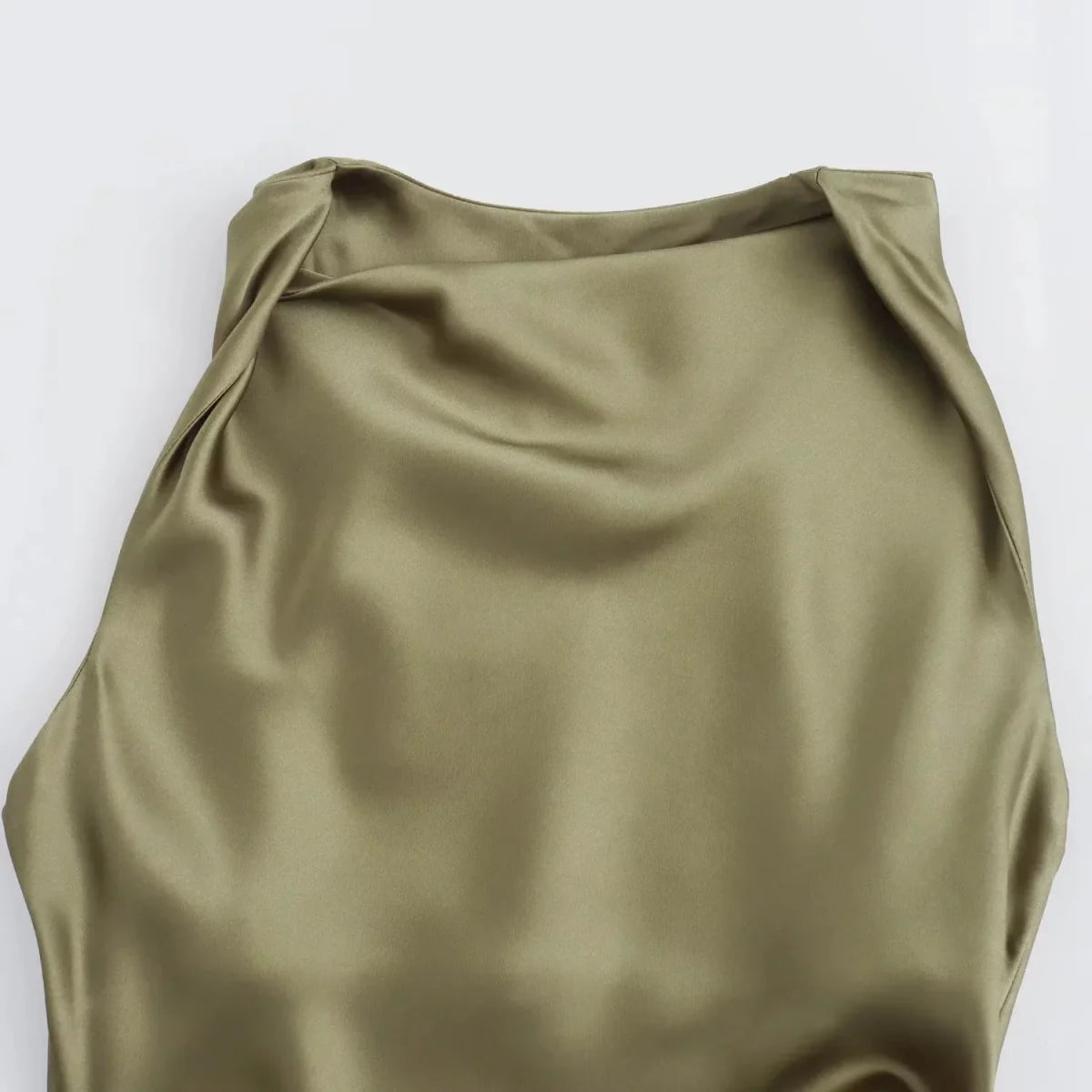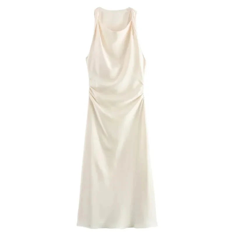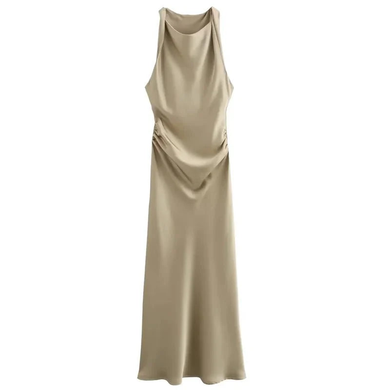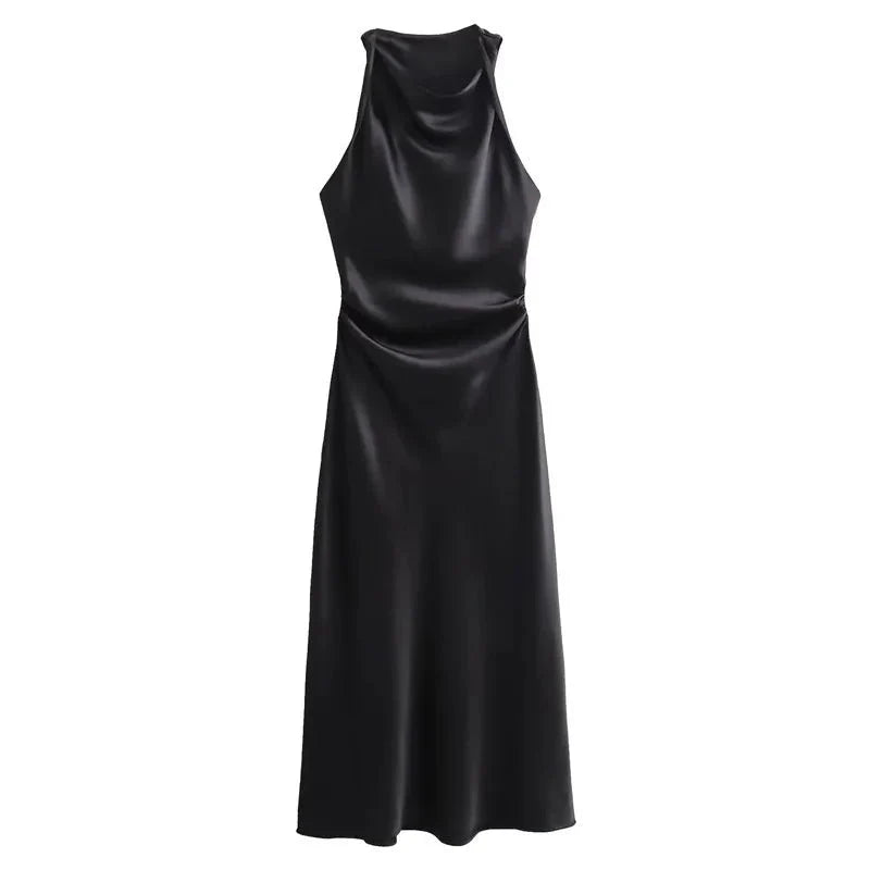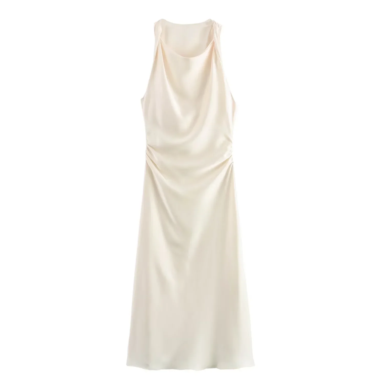 Design: A chic ruched satin midi dress featuring a square collar and off-shoulder design. The sleek. straight silhouette enhances your figure while adding a touch of sophistication and elegance.