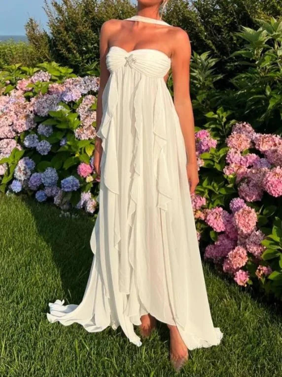Step into sophistication with this chic ruffle midi dress. Featuring an off-shoulder. backless design with a high slit and scarf detail. it offers a loose A-line silhouette and full sleeves. Crafted from polyester with slight stretch. it's perfect for elegant evenings and stylish events.