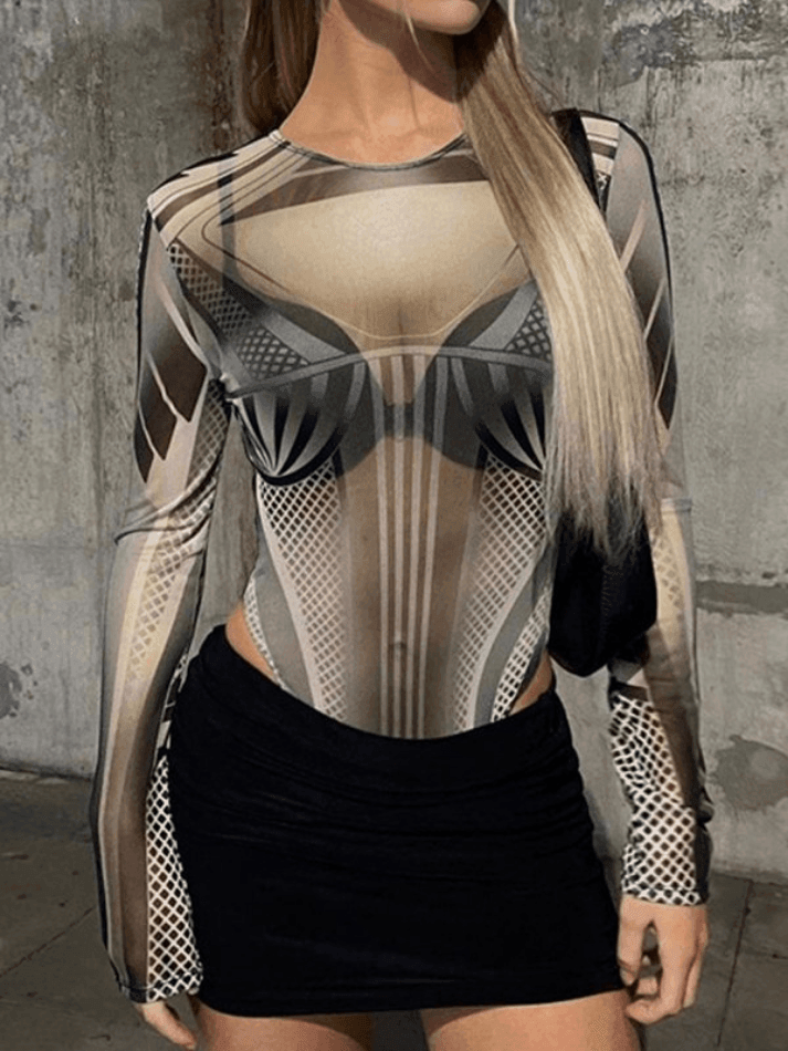 Description: Embrace retro vibes with this mesh long sleeve bodysuit. Crafted from semi-sheer fabric. it offers a soft feel and stretchy comfort. The fitted silhouette and allover pattern print design add a touch of uniqueness.