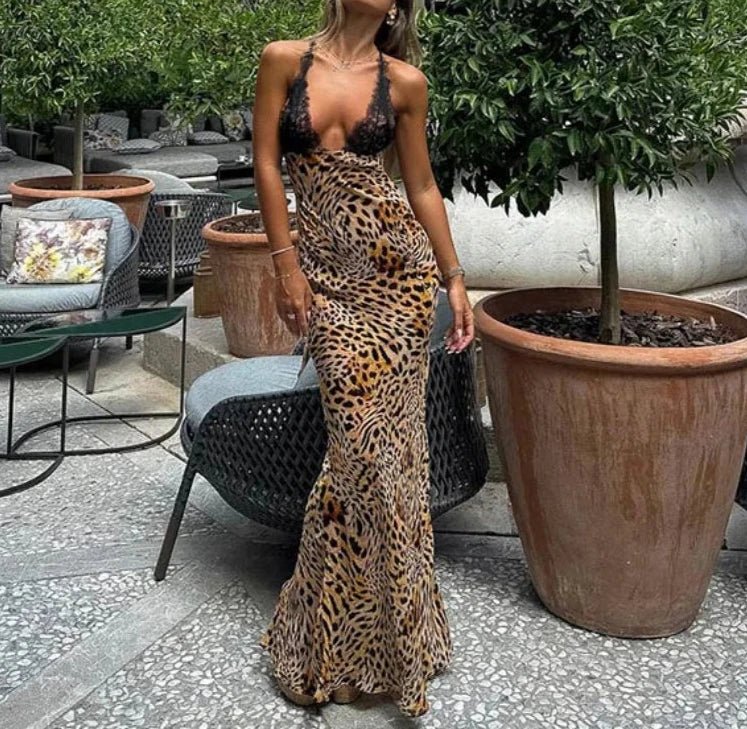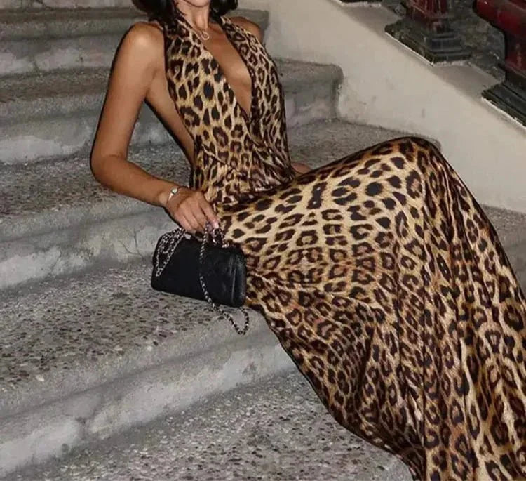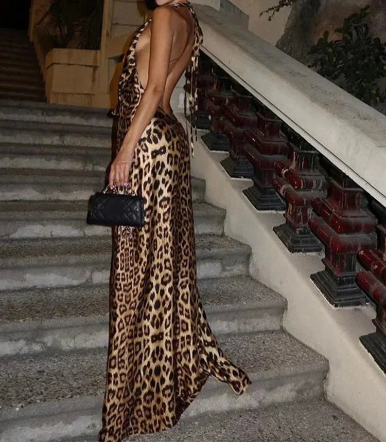 Sexy Backless Leopard Printed Dress with a bold vintage style. Featuring a V-neckline and full-length sleeves. this loose-fit. floor-length dress showcases a striking leopard print. Made from polyester with a straight silhouette. it offers a non-stretch fabric for a sleek and comfortable fit. The dress includes a zipper closure and an empire waistline. perfect for adding a touch of wild elegance to any occasion. Free of high-concern chemicals. it's crafted from synthetic fibers for durability and style.