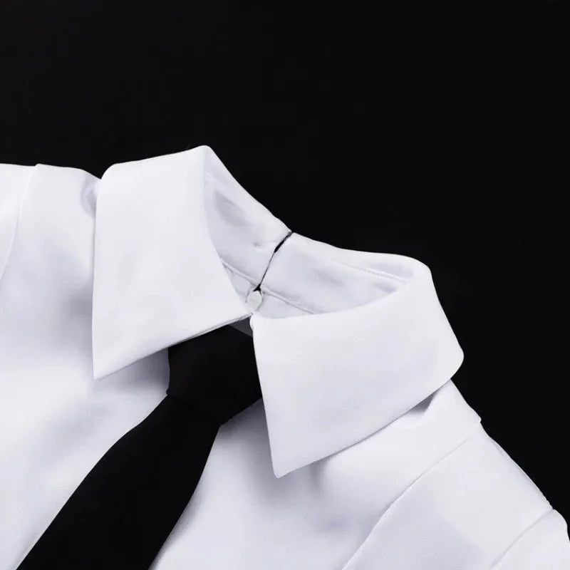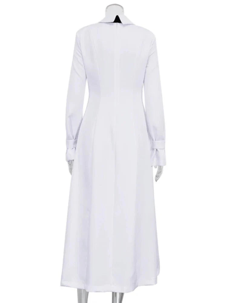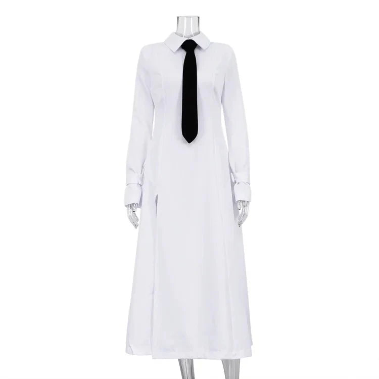 Design: A sophisticated long shirt dress featuring a sharp turn-down collar. elegant tie-waist detail. and a flattering side slit. The slim-fit silhouette adds refinement. while its minimalist style delivers effortless chic.