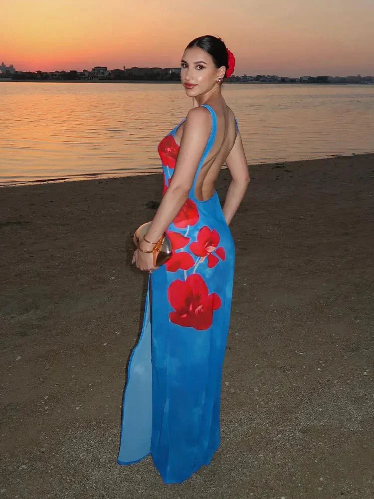 Design: A printed A-line dress featuring a square neckline. sleeveless. and a stylish side split. The backless detail adds a hint of allure to its breezy summer silhouette.
