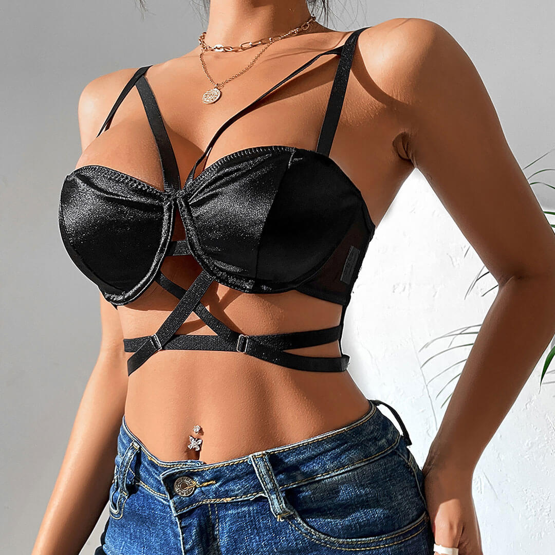 Romance bra top for you. Unique and oh-so-trendy. this bandage-style bra is a sleeveless top. Its pull-on fitted bodice. adorned with adjustable straps at the front. offers a sultry twist and ensures a perfect fit that accentuates your curves. The semi-sheer mesh back adds a daring touch of flair. tantalizingly revealing a glimpse of skin while maintaining an air of mystery. With its ultra-short hemline. this sexy bra top exudes sass and confidence. allowing you to make a statement wherever you go. It's the perfect combo of fun and flirty! Let's get romantic!