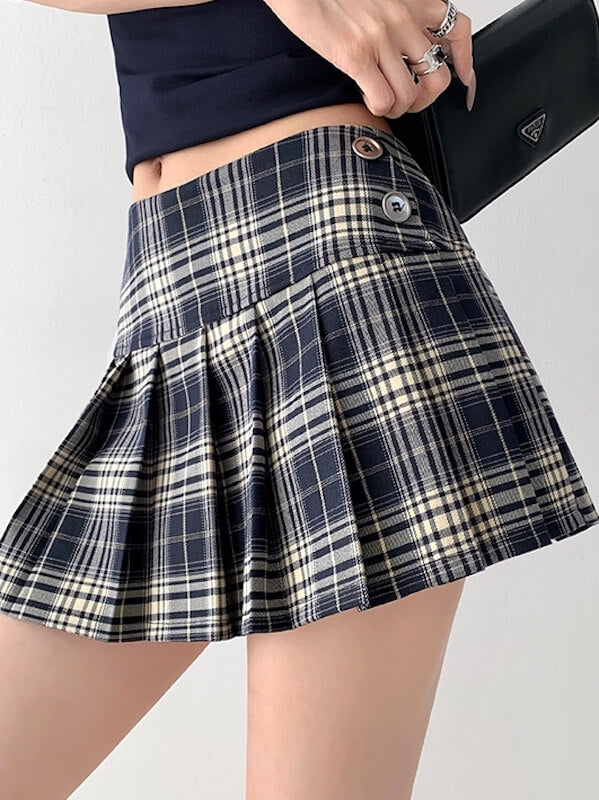 Elevate your style with the Spicy girl plaid mini skirt! This low-waisted skirt features a unique skort design and eye-catching button decorations. Made with a blend of polyester. vicsore. and spandex. it offers comfort and flexibility while maintaining its sleek look. Choose from Blue Apricot or Red Black and rock this plaid pleated masterpiece in sizes S. M. and L.