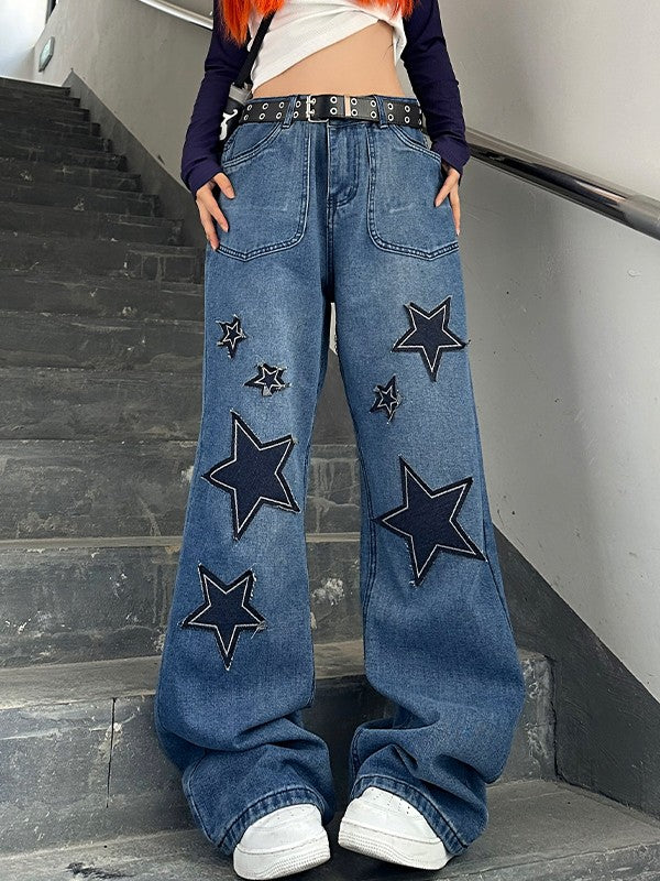 Description: Boyfriend jeans are still trending up now. it's essential and versatile to style. These boyfriend jeans have a relaxed silhouette. featuring contrast star patches to the leg. with multi simple pockets. and fastened a zipper button fly design.