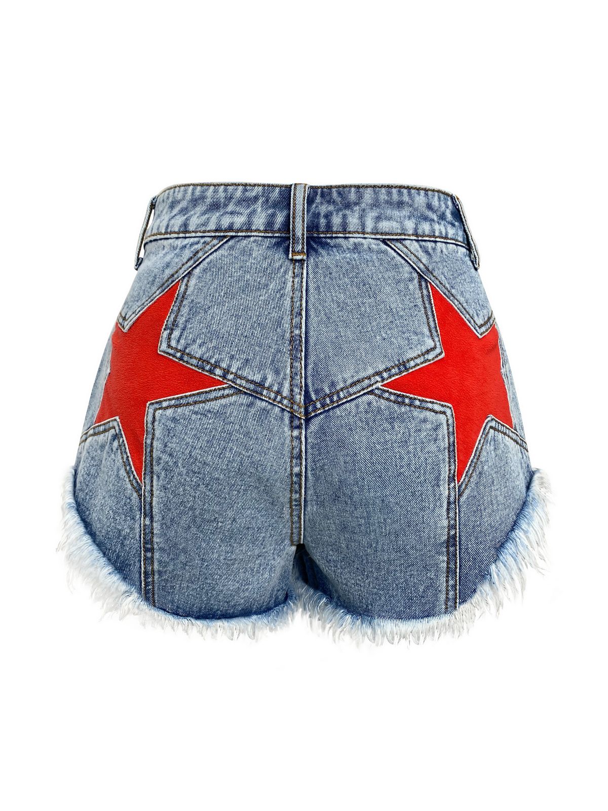 Design: These washed denim shorts sitting high on the waist. features star patched at back. with frayed raw cut hem. multi pockets design and a zip button fasten at front.